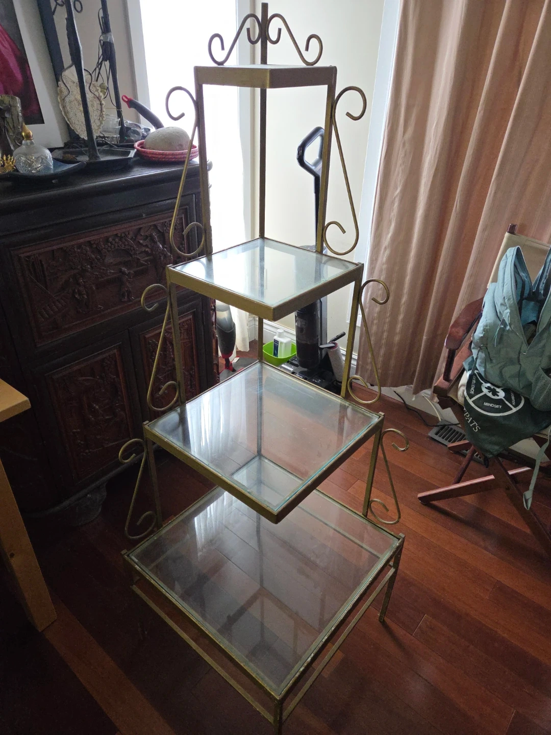 A stylish 3-tier display shelf with a gold-tone metal frame and glass tiers. It's perfect for showcasing plants, decor, or collectibles. The tiered design offers ample vertical display space.