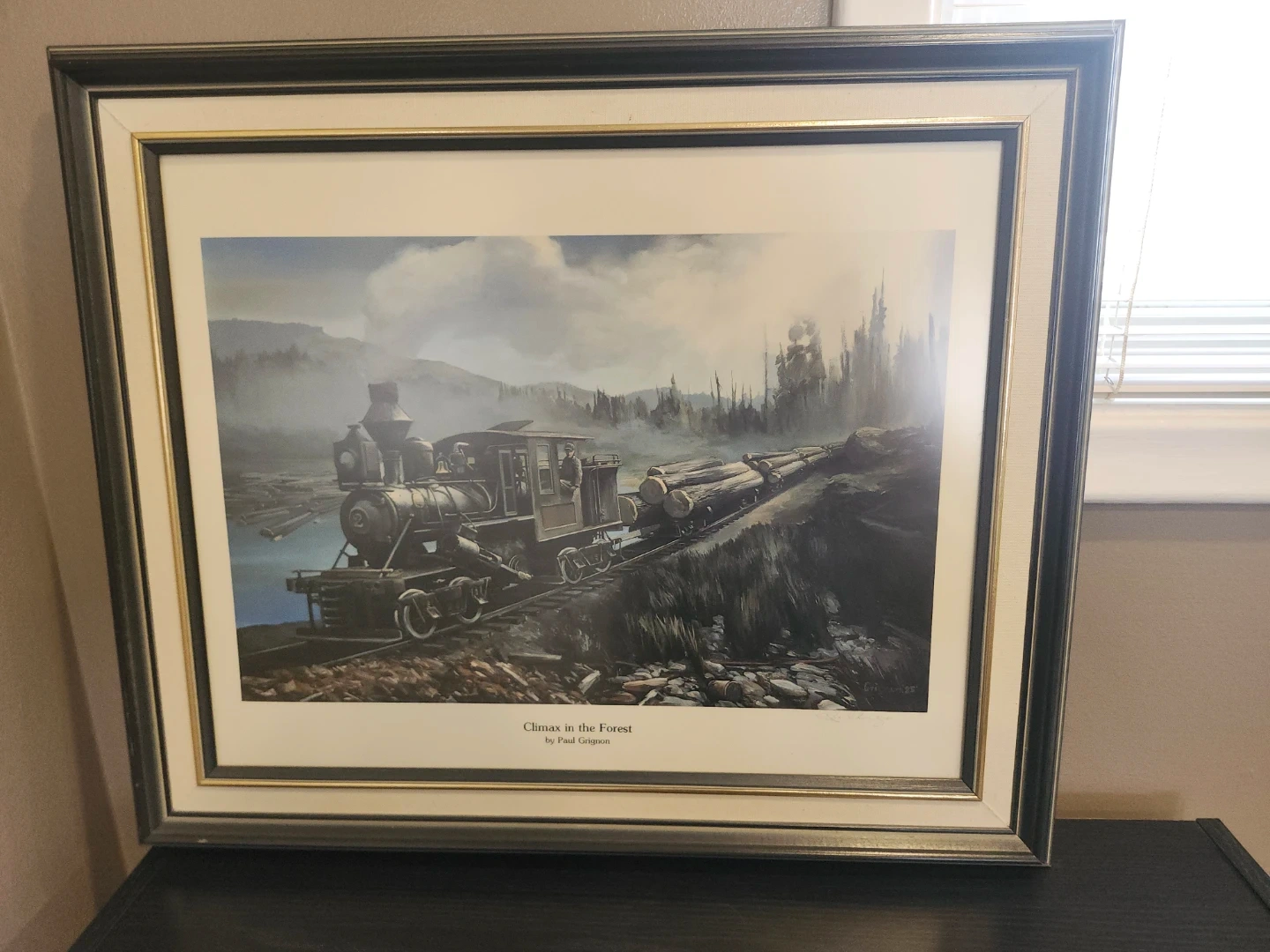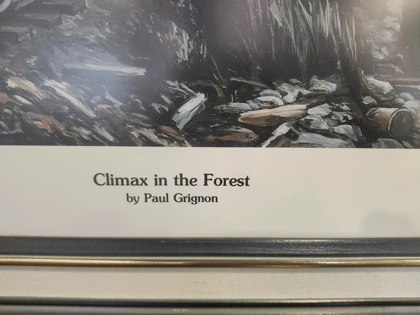 Framed art print titled "Climax in the Forest" by Paul Grignon. Features a steam train transporting logs through a forest landscape. Professionally framed with a mat and dark wood-effect border. Measures approximately 30" x 24".