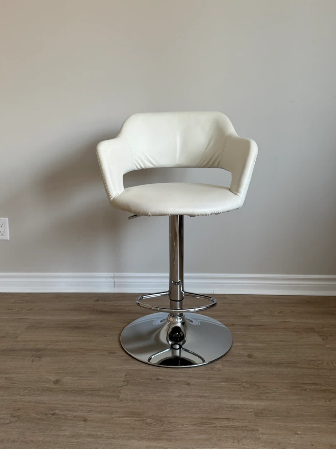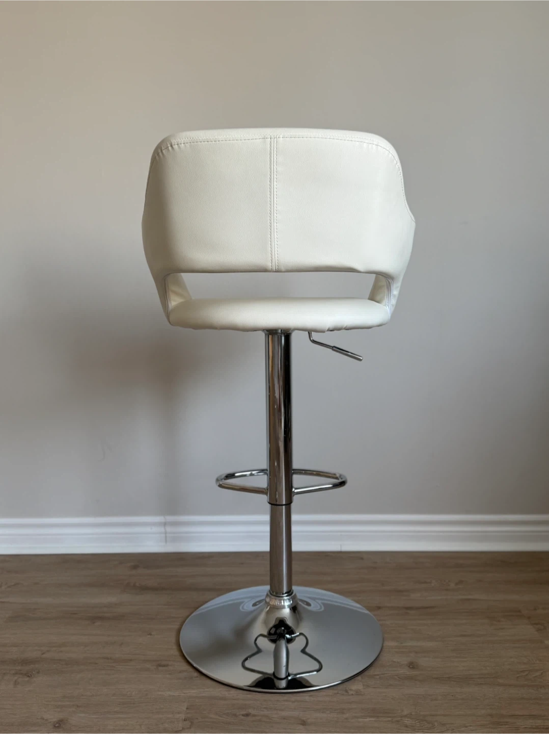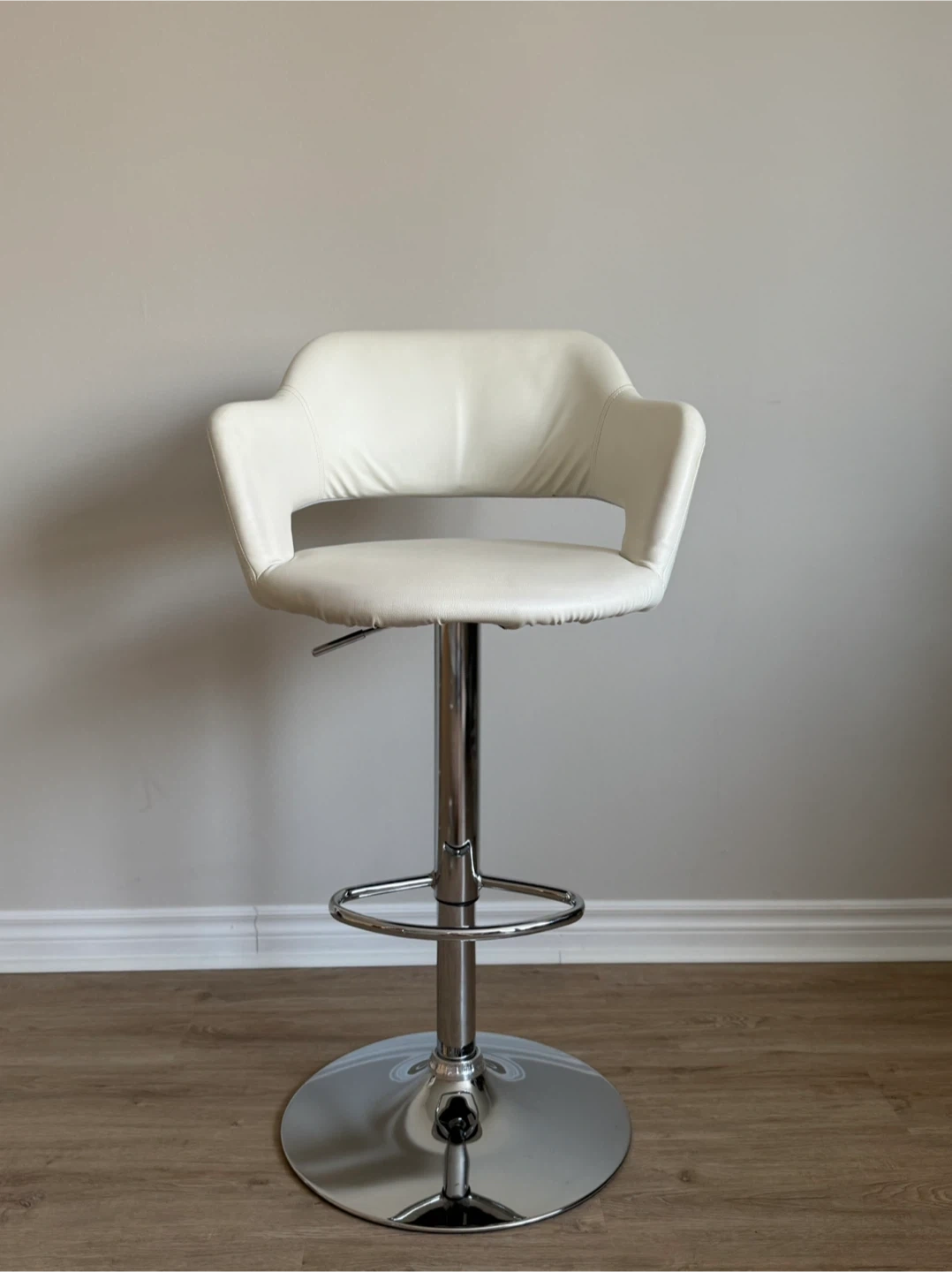 Adjustable height bar stools with chrome base and footrest. Upholstered in white faux leather. These chairs feature a supportive backrest and comfortable seat. Perfect for a home bar or kitchen island!