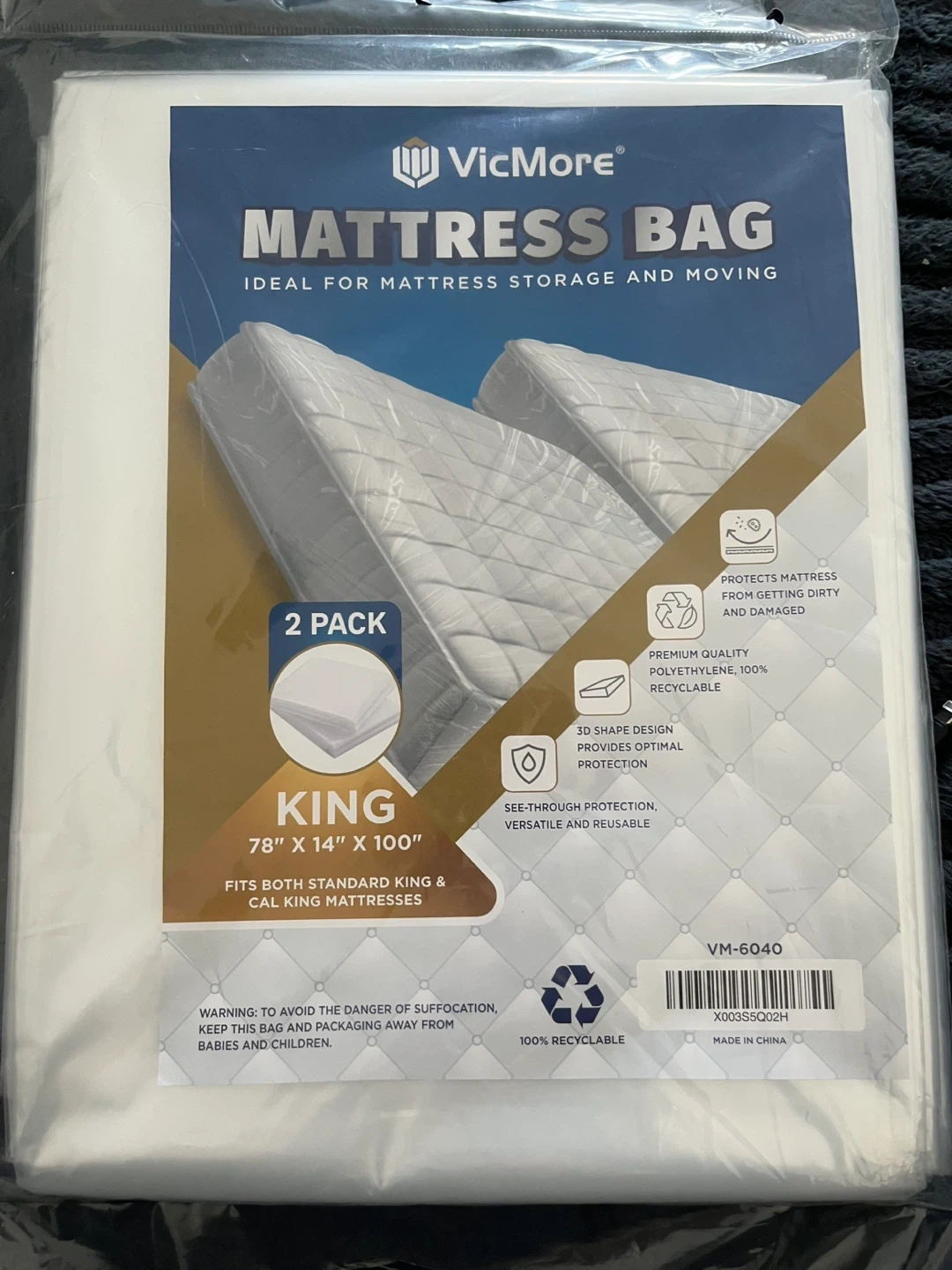 This is a 2-pack of VicMore King size mattress bags. They fit both standard King and Cal King mattresses and are made from 100% polyethylene. These bags offer see-through protection, are versatile, and reusable, ideal for mattress storage and moving.