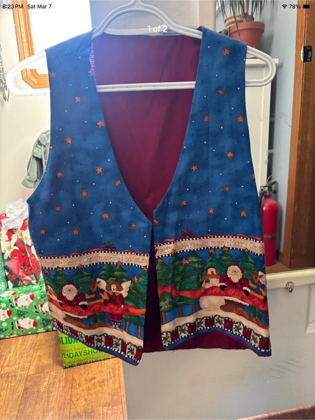 This handmade ladies vest features a blue starry night pattern on one side, and a festive Christmas scene with Santa, reindeer, and angels on the other. It's adorned with a cute bow detail at the back. Perfect for holiday gatherings!