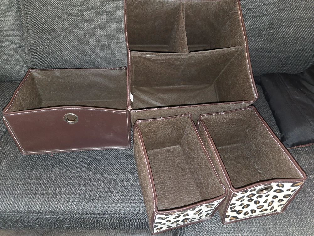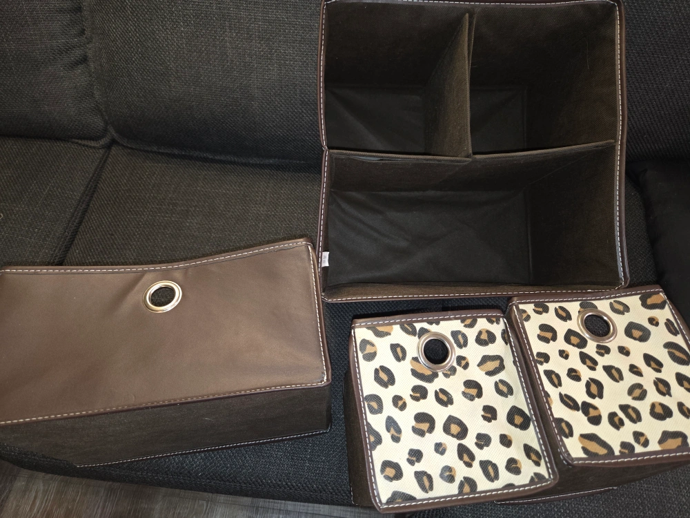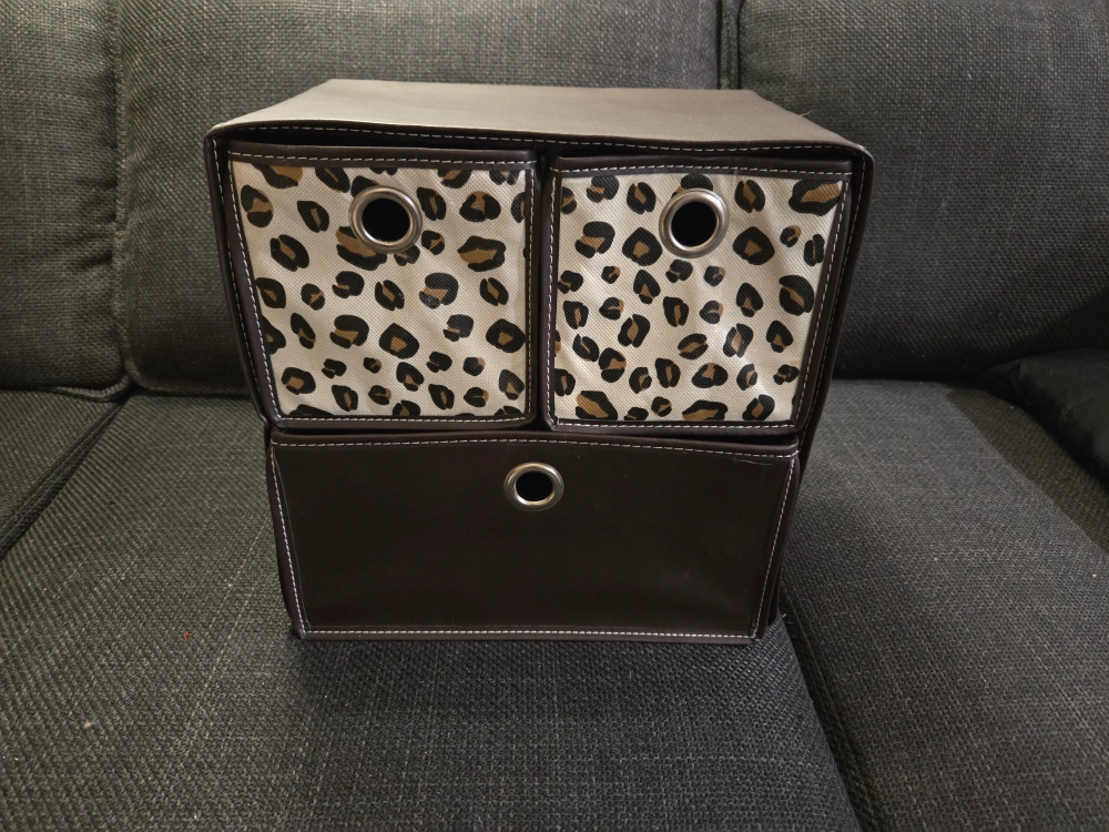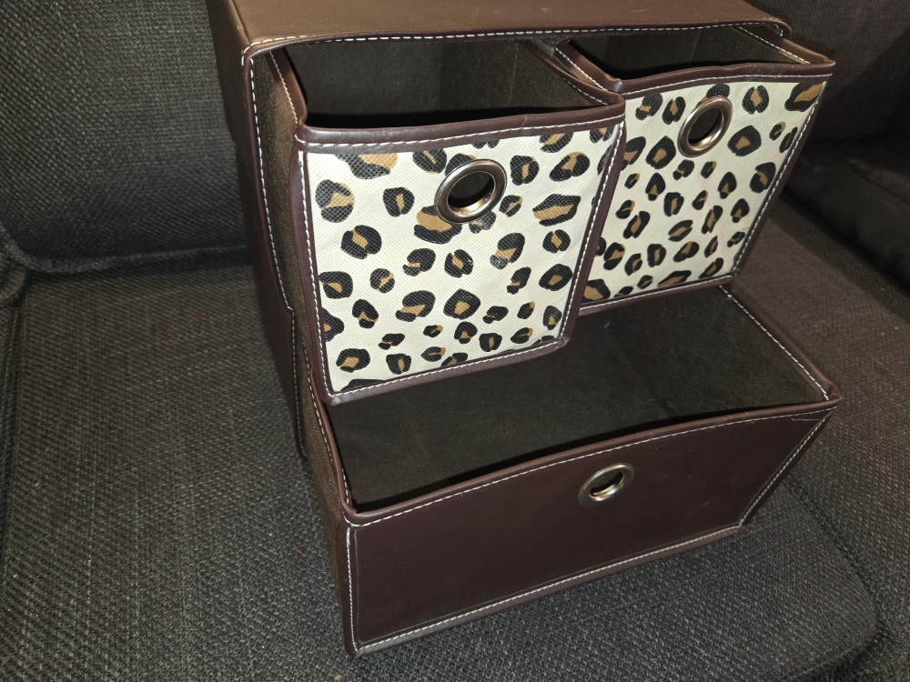 Here's a cute storage box that's perfect for organizing your space! It has a brown faux leather exterior with two leopard print drawers on top and a larger drawer at the bottom. It's in great condition and is perfect for keeping your space tidy and fun. Also fits nicely into a cube storage unit or beautifuly on a floor, desk, or ottoman.