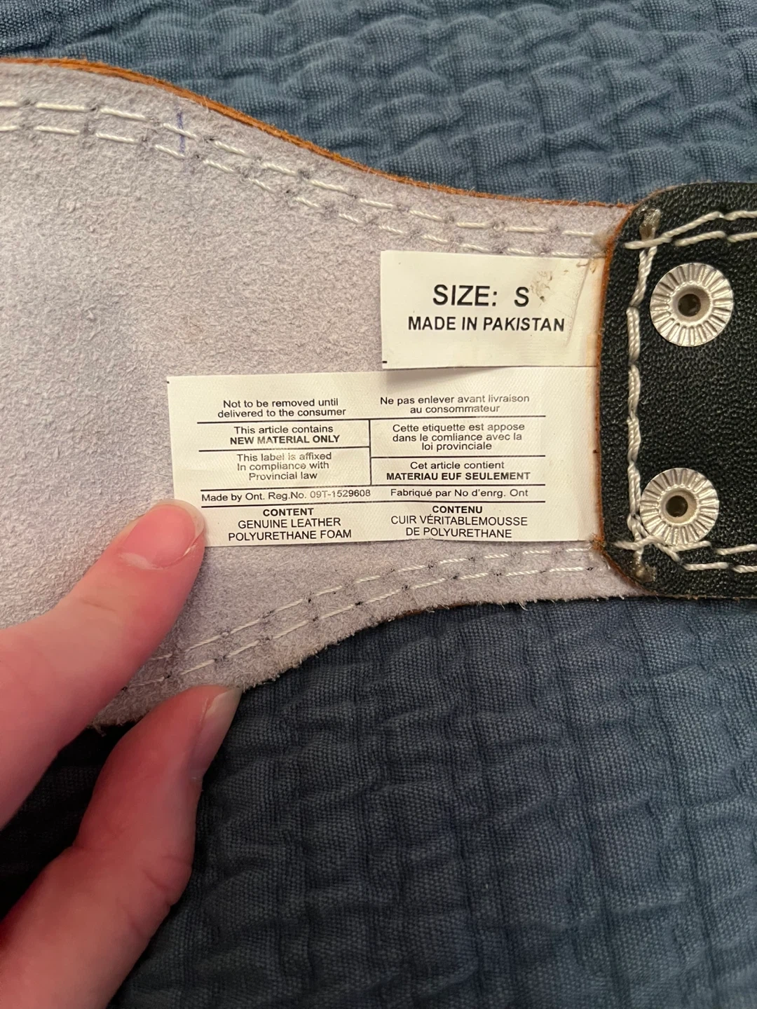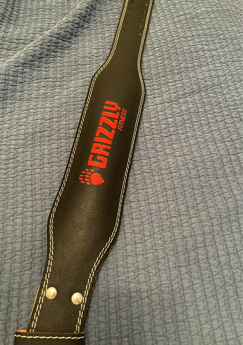 This is a Grizzly Fitness weightlifting belt. It's a size small and made of genuine leather and polyurethane foam. The belt is black with white stitching and a double prong buckle.