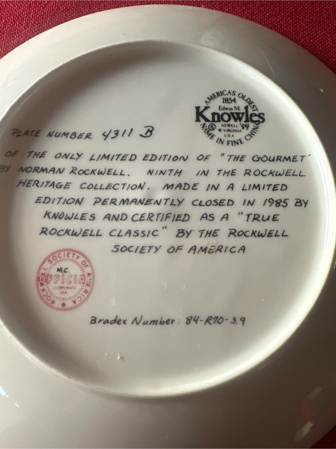 Limited edition collector plate "The Gourmet" from The Rockwell Heritage Collection. Made by Edwin M. Knowles and certified as a "True Rockwell Classic" by the Rockwell Society of America. Plate Number 4311 B.
