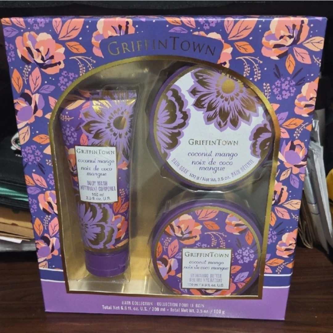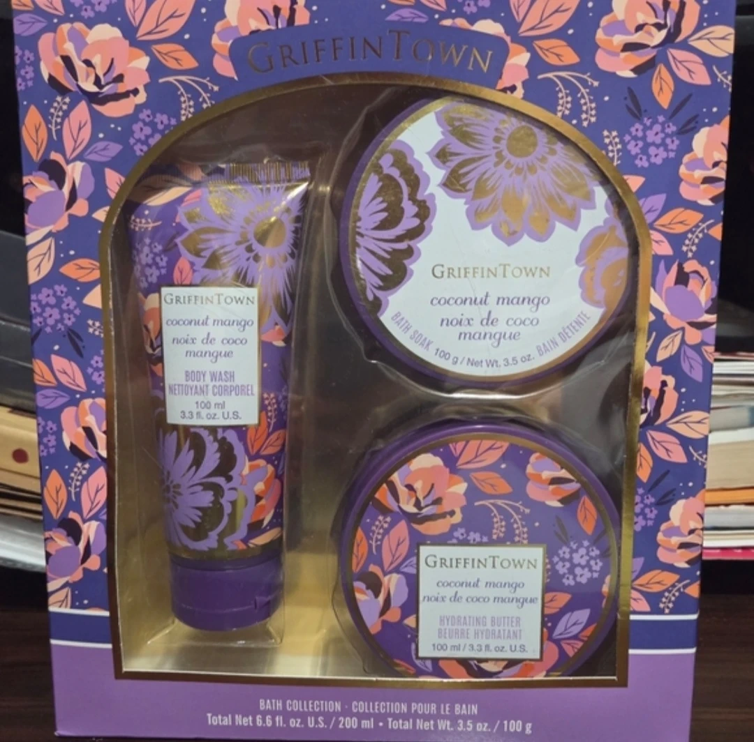 This bath collection set features coconut mango scented body wash and hydrating butter. It also includes a bath soak. Makes a nice gift!