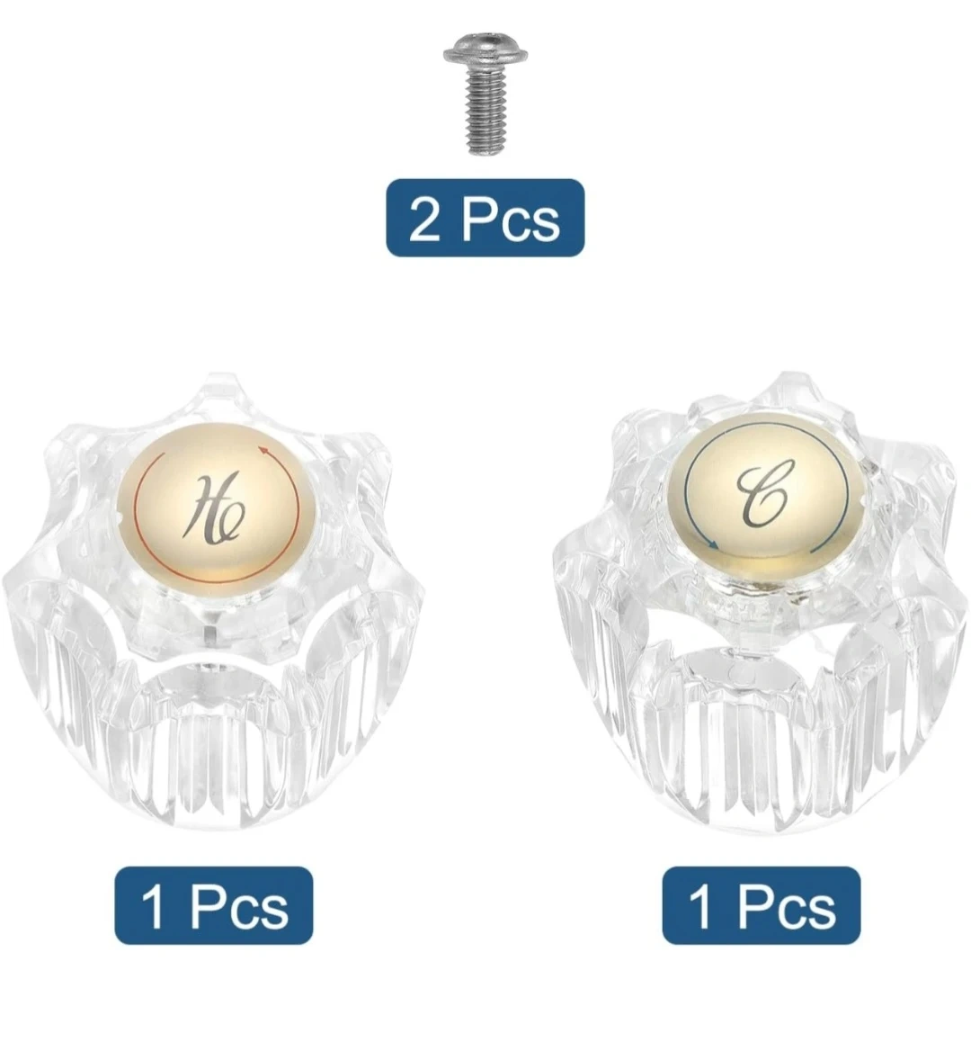 These clear acrylic faucet handles are designed for hot and cold water applications. They come with screws for easy installation. Each handle features a distinct 'H' or 'C' marking for hot and cold identification. Made from durable acrylic.
