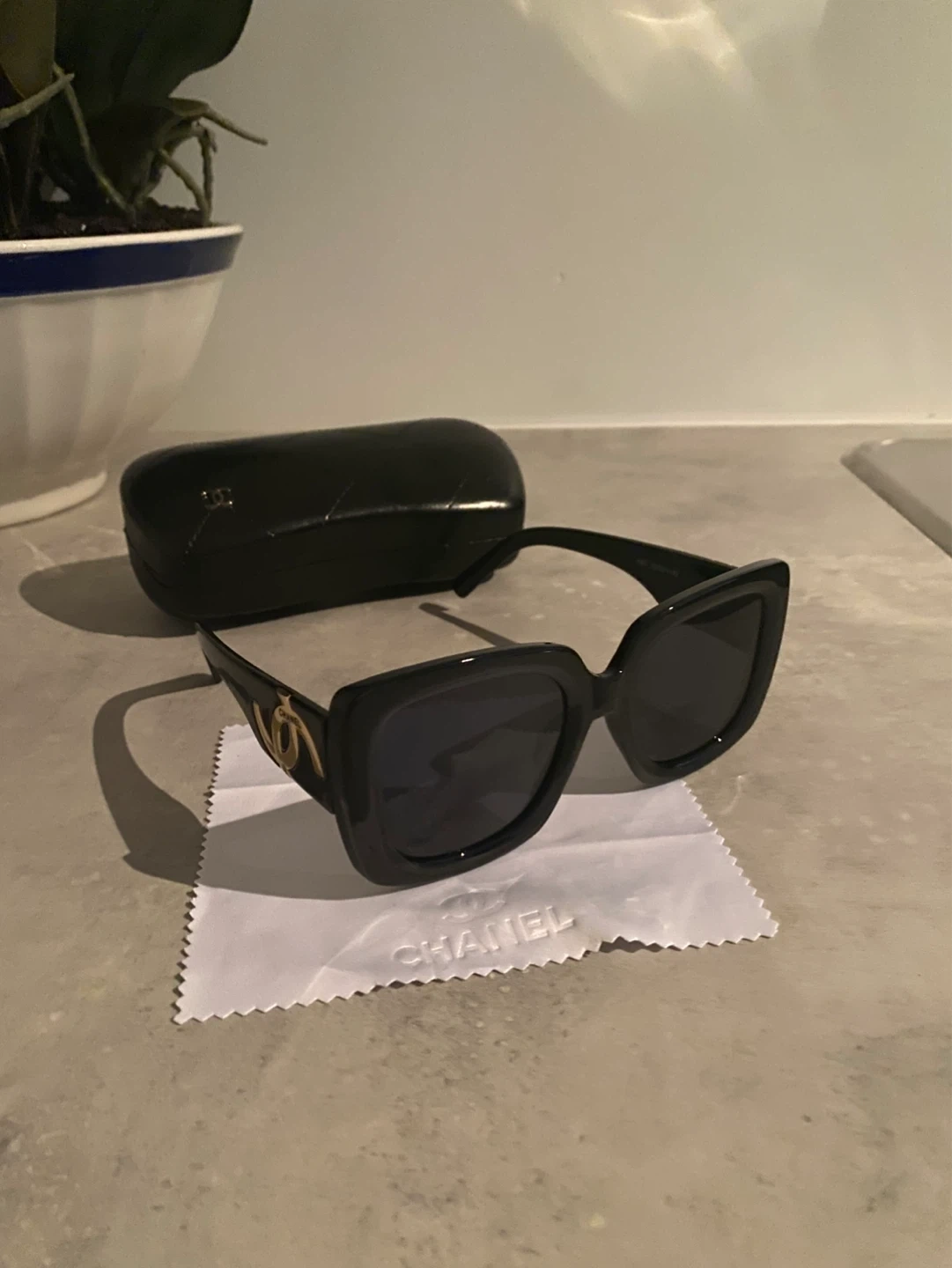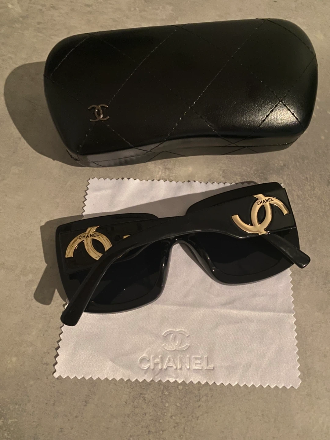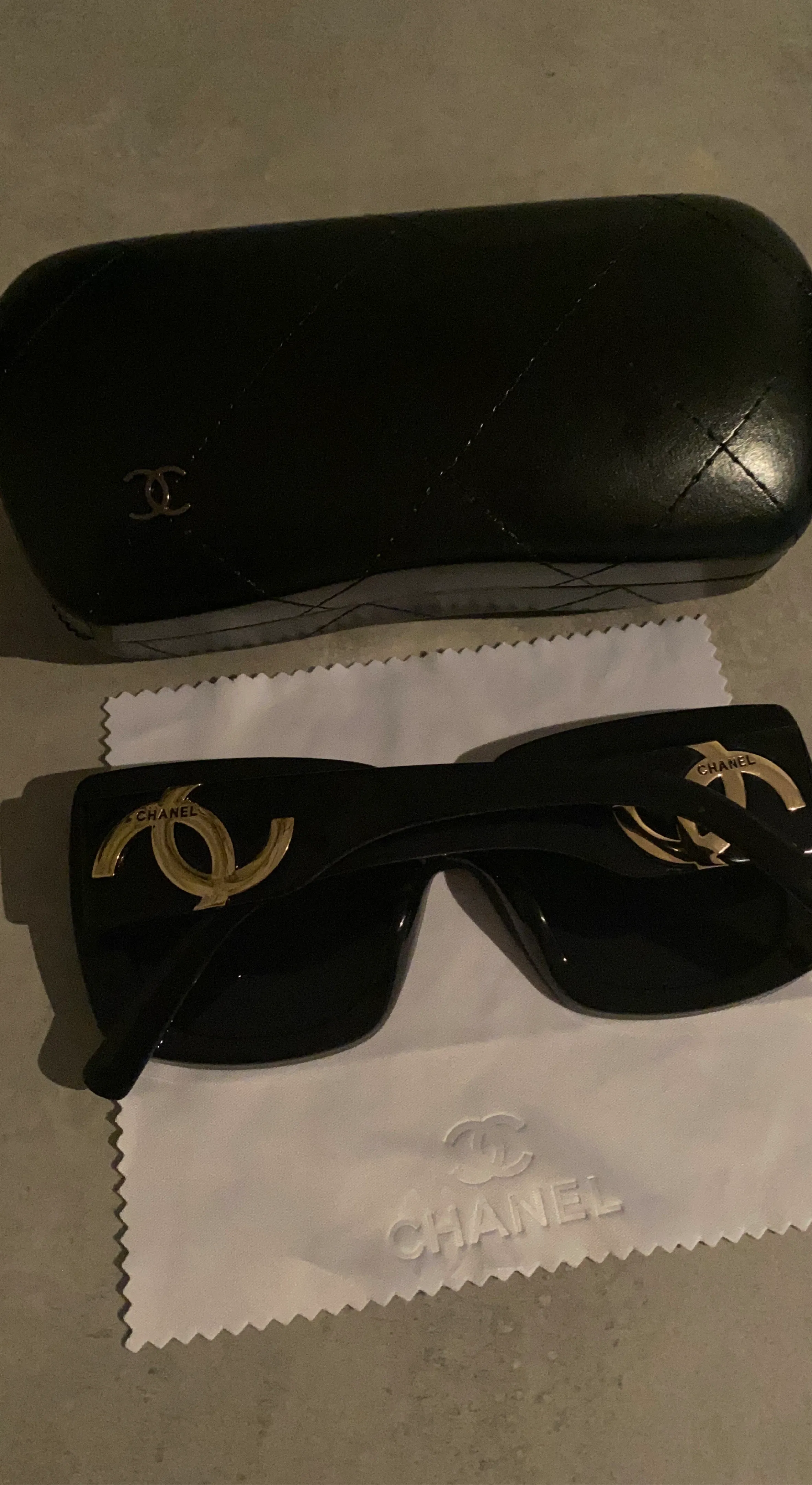 Black Chanel sunglasses with gold-tone CC logo detailing. Comes with a quilted black case and cleaning cloth. These statement sunglasses add a touch of luxury.
