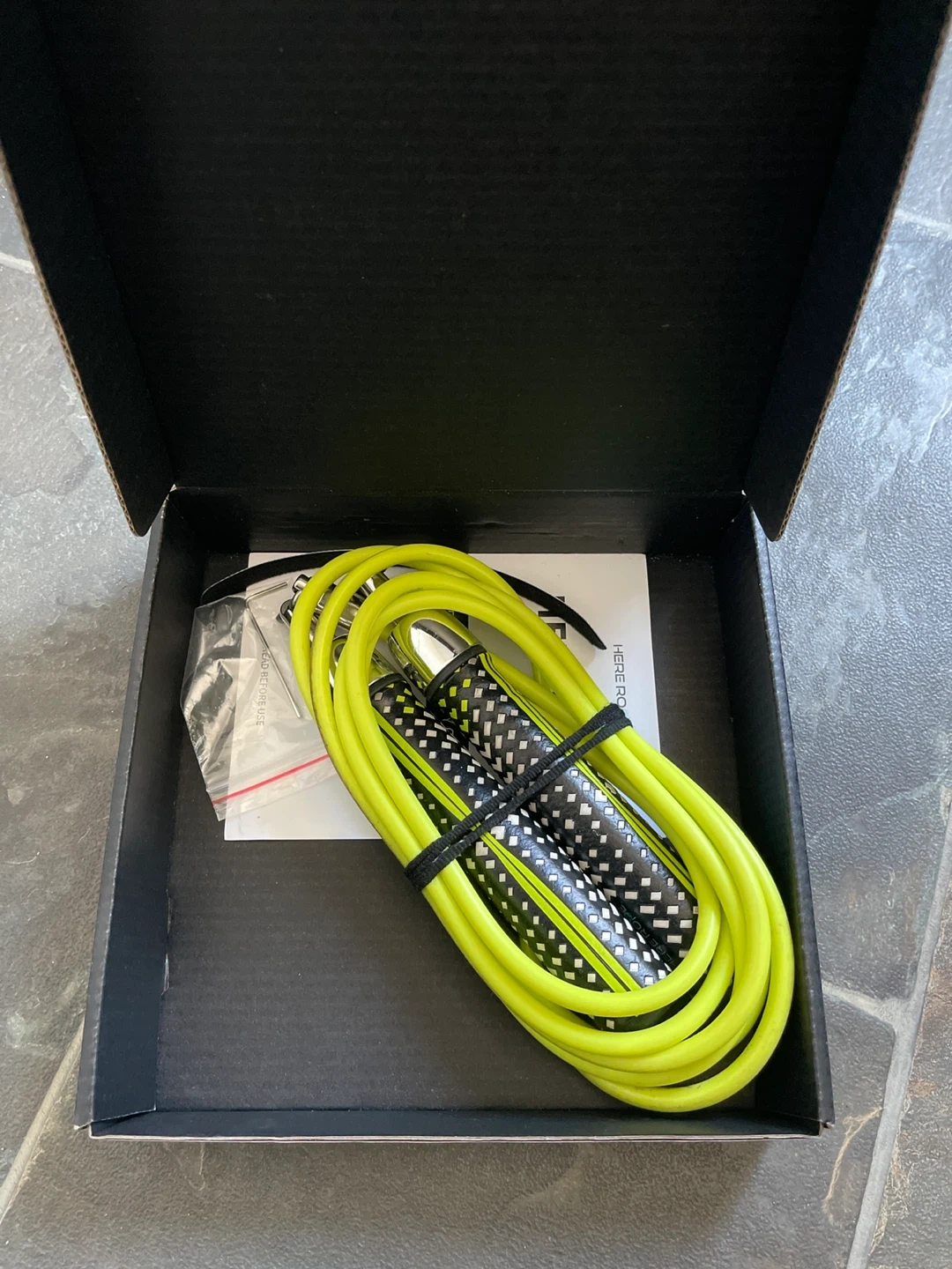 This is the HERE ROPE speed jump rope. It has adjustable handles and a bright yellow cable. It comes with the original box. Great for cardio and speed training!