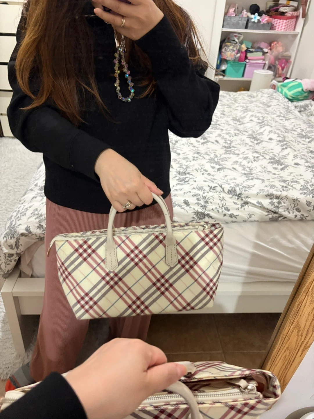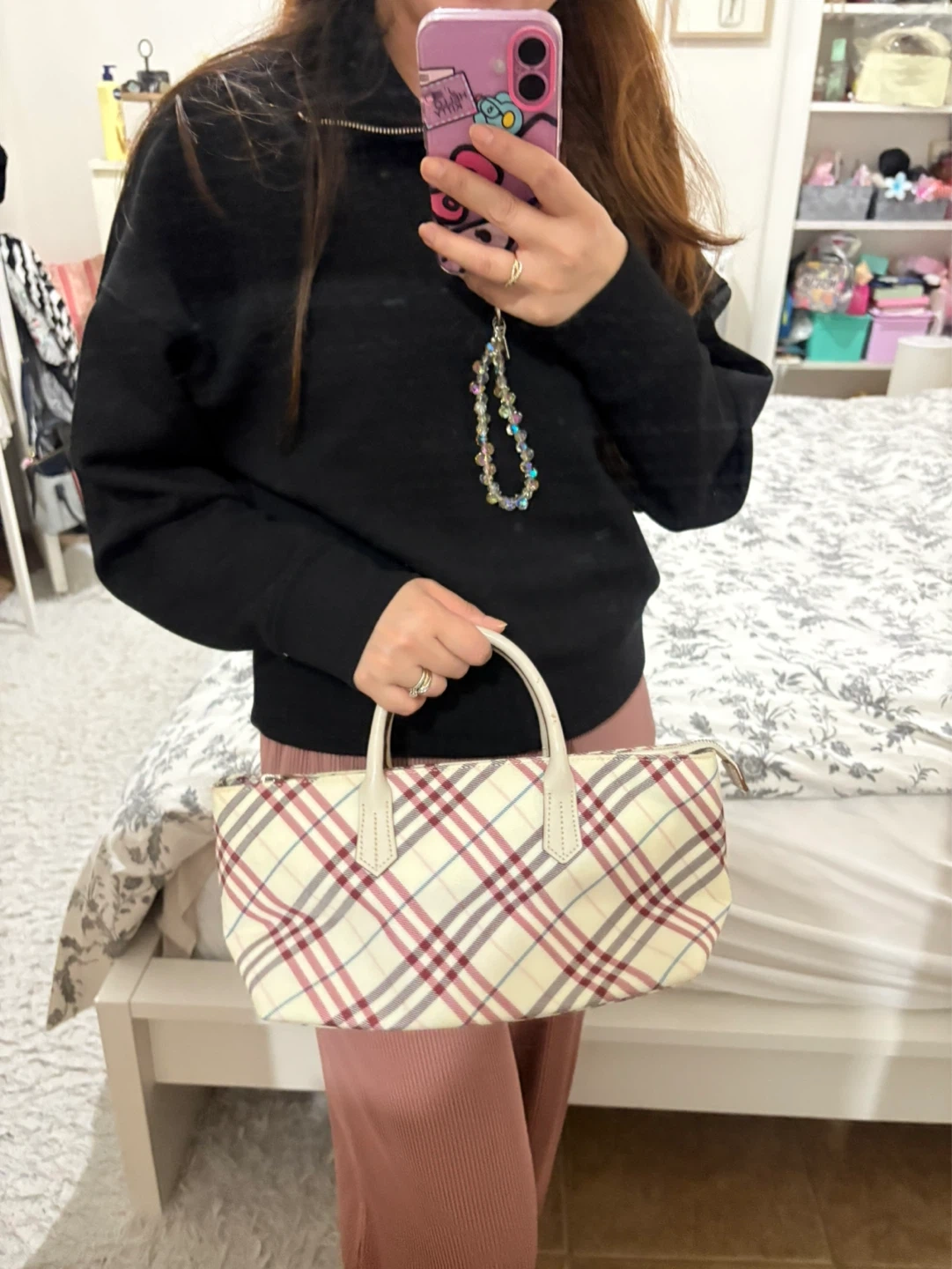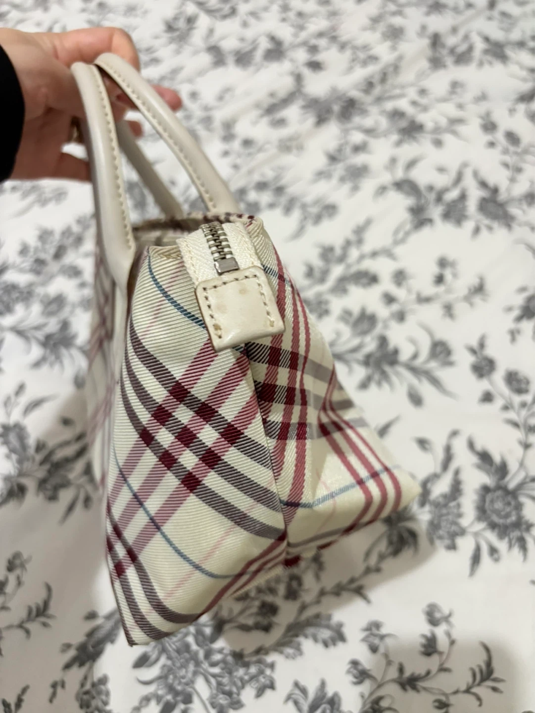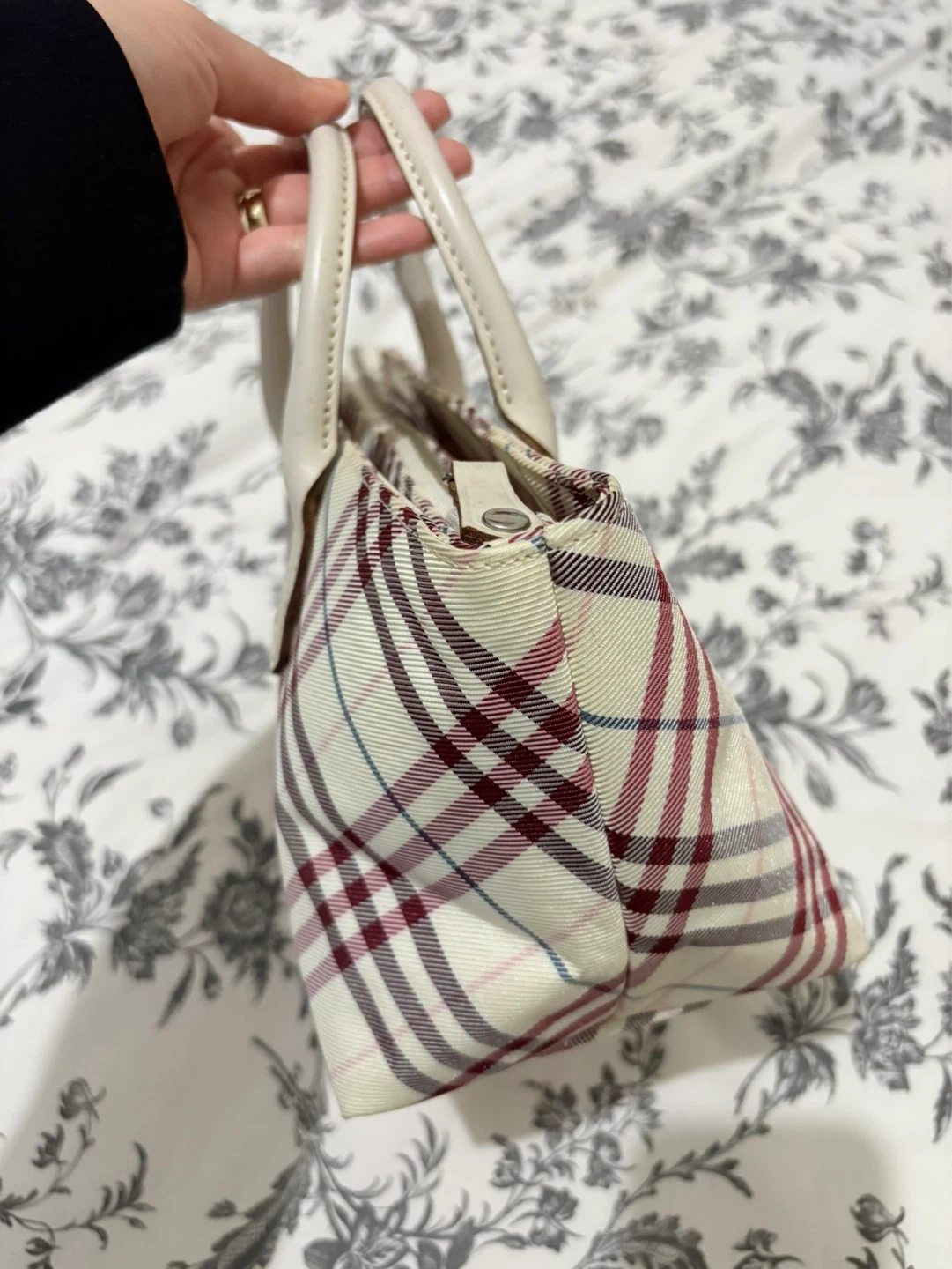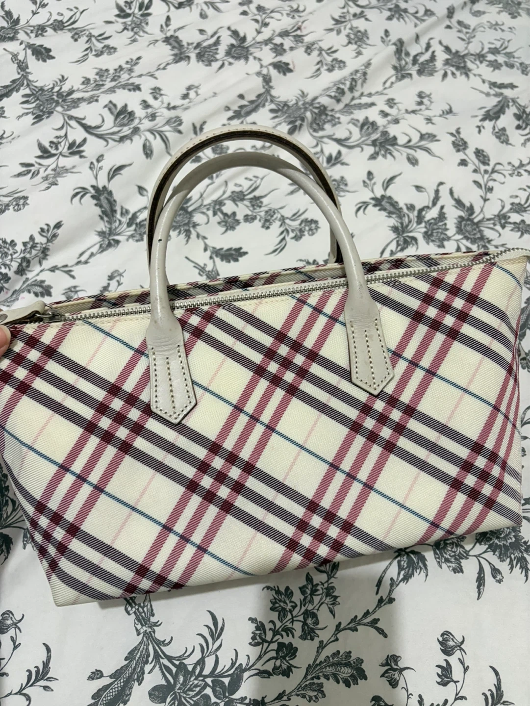 A small Burberry tote bag with the iconic Haymarket check pattern. Features a cream canvas body with leather trim and handles. The interior is lined with pink fabric and includes a zippered pocket.