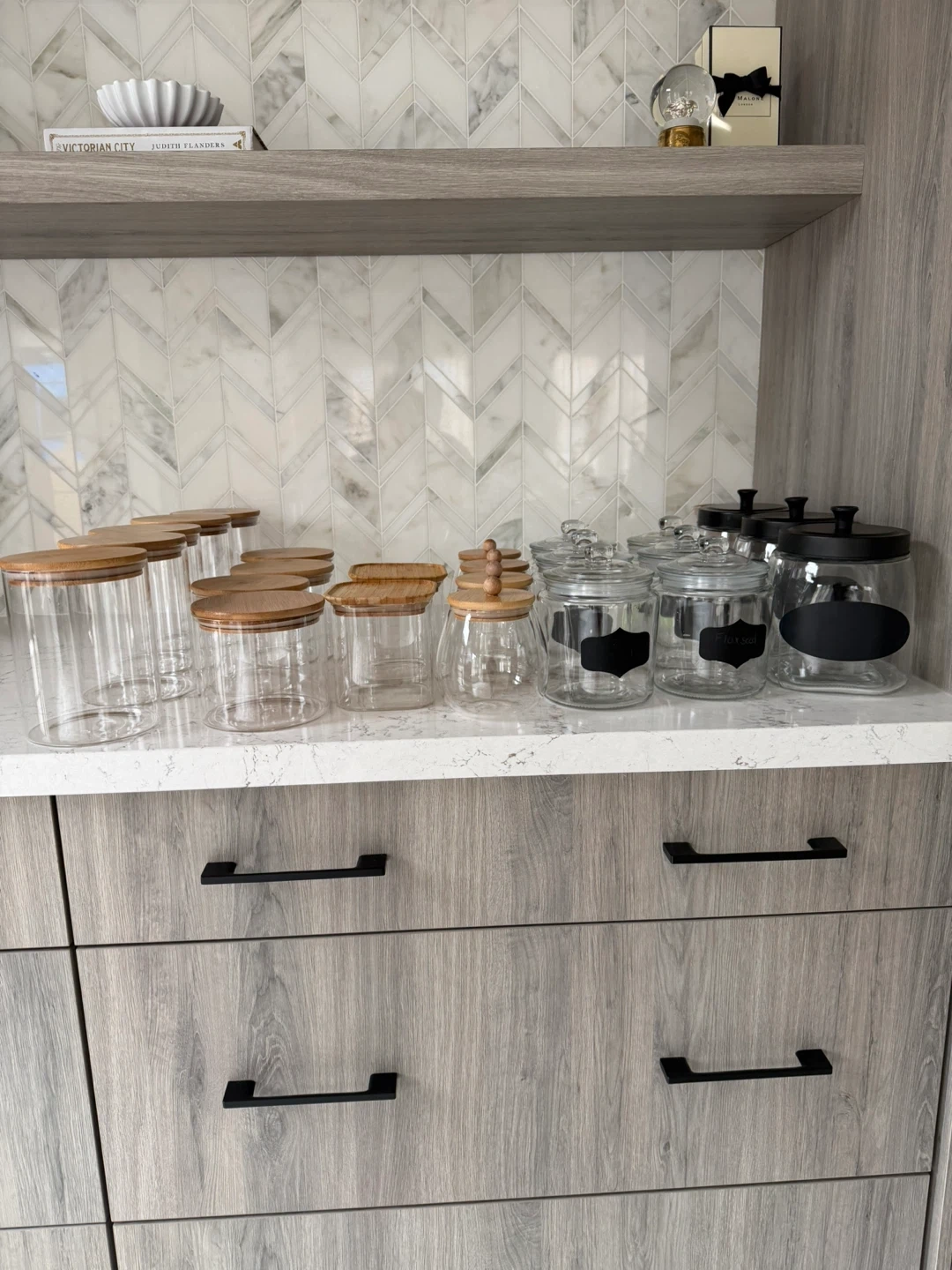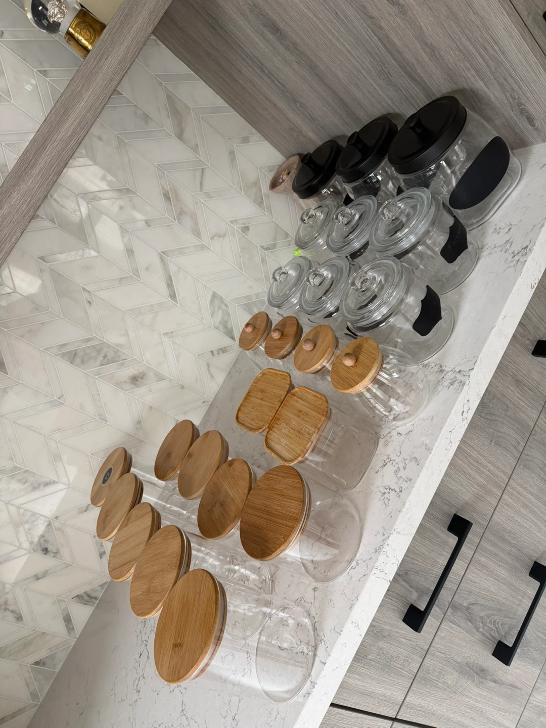 This is a collection of glass storage jars with various lid styles, including bamboo and black options. Some jars come with chalk label stickers for easy organization. They're great for pantry staples or kitchen organization.