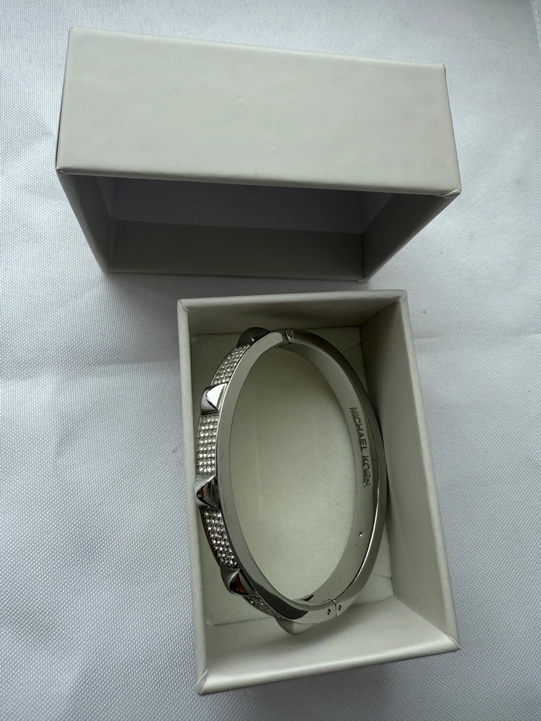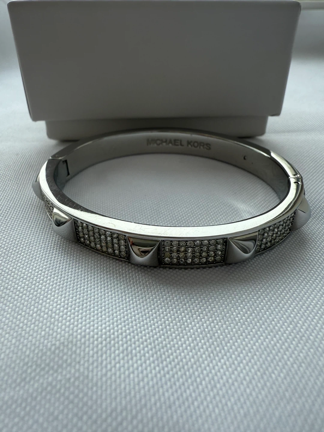 Silver-tone Michael Kors bangle bracelet. It's adorned with pyramid studs and clear crystals. Includes original box. Perfect for adding a touch of glam to any outfit!