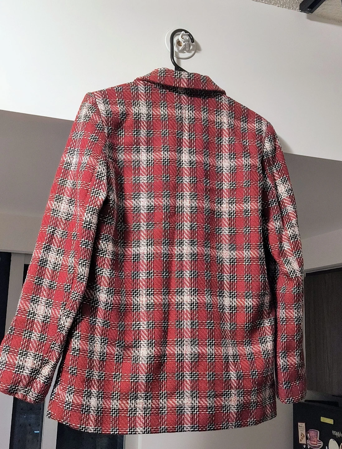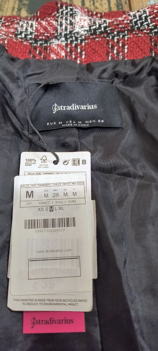 This is a Stradivarius women's blazer. It features a red, white, and black plaid pattern. The blazer is a size medium and has two gold-toned buttons at the front. It's perfect for layering over tops for a stylish look.