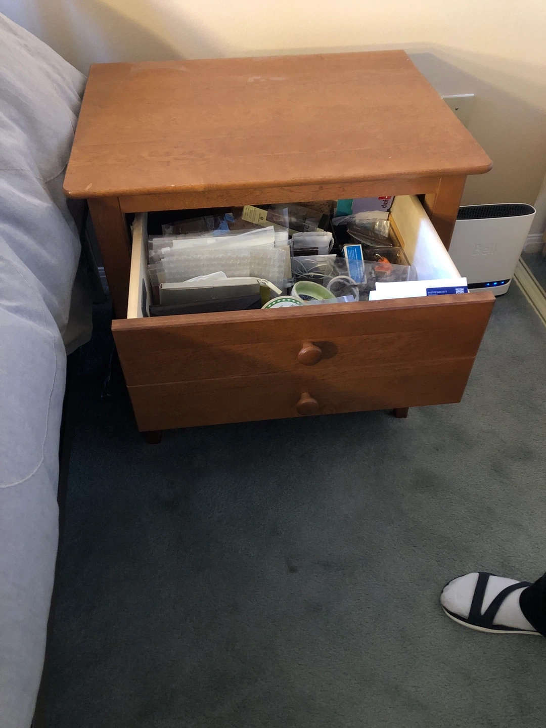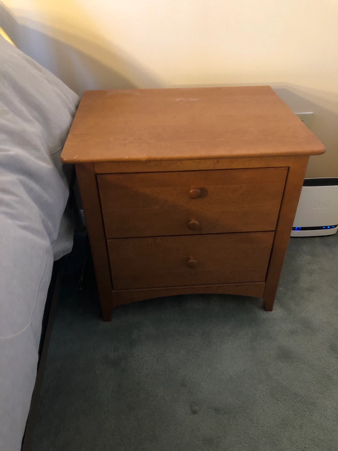 Here's a wooden nightstand with two drawers. It's perfect for keeping your bedside essentials organized. It's in good condition and ready for a new home