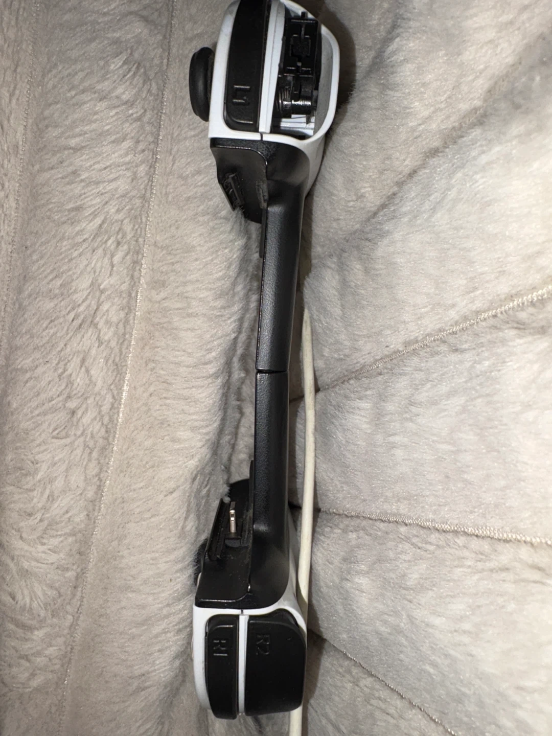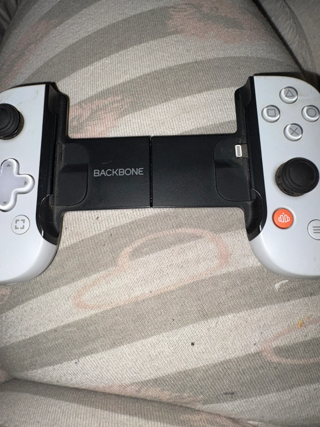 This is a Backbone One controller designed for iPhones. It offers a console-like gaming experience on your phone. Connects via Lightning. White and black design.
