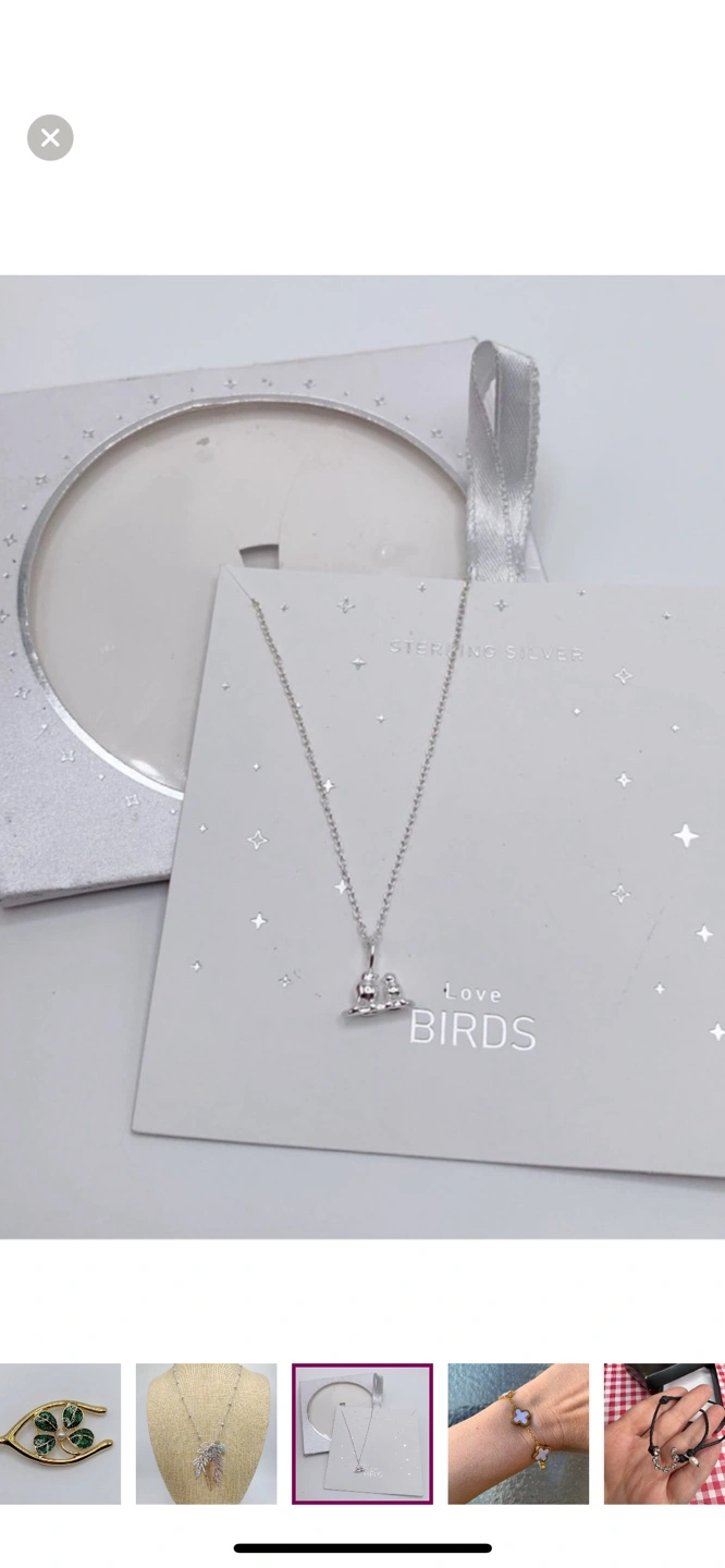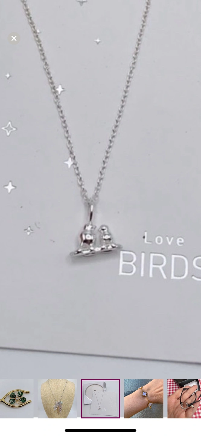 Adorable silver necklace. Features two birds perched on a branch. Comes in original packaging. Perfect gift.