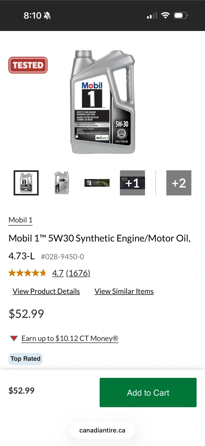 1 bottles of Mobil 1 5W-30 synthetic engine oil. Full synthetic advanced protection. Each bottle is 4.73 L / 5 U.S. Qts. Protects up to 16,000 kilometres.