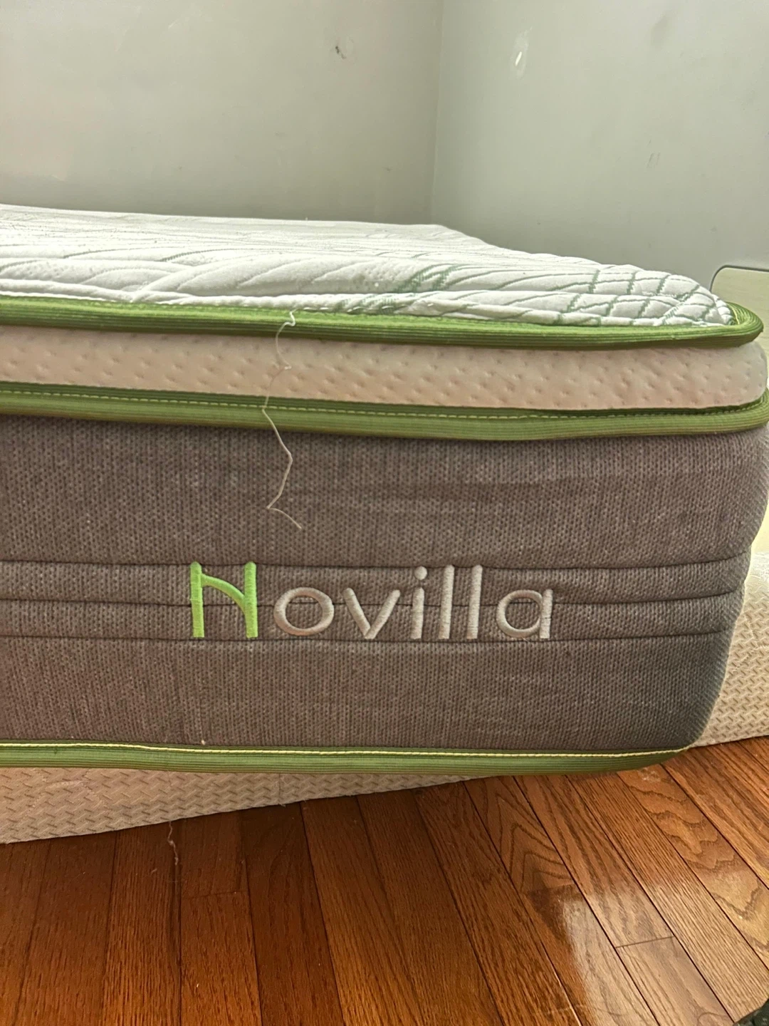 This is a Novilla mattress. It features a quilted top with a grey and green side panel design. Box spring included.