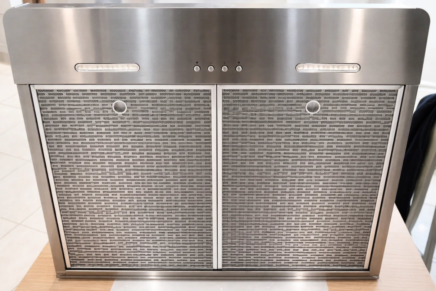 This is a stainless steel range hood with built-in lights and a powerful ventilation system. The hood has a wide coverage area to effectively remove smoke and odours.