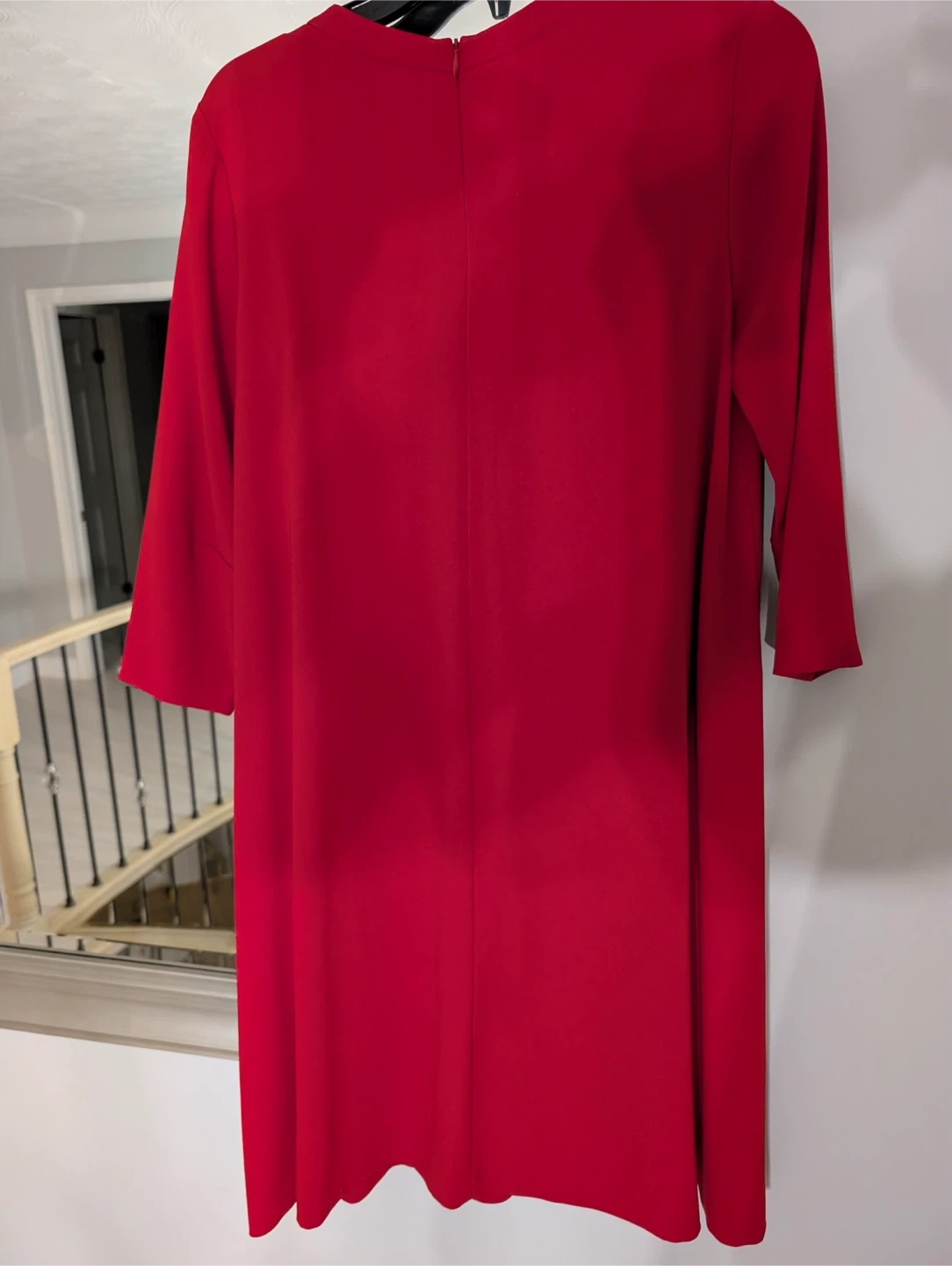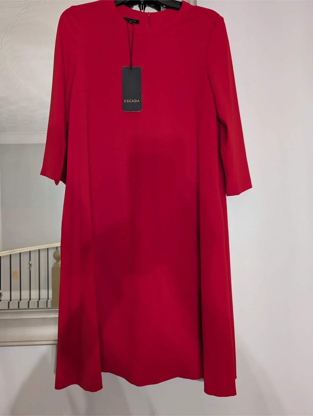 Escada women's dress in a vibrant cherry red. Size 36. Made in Romania. This classic style features 3/4 length sleeves and a flattering A-line silhouette.