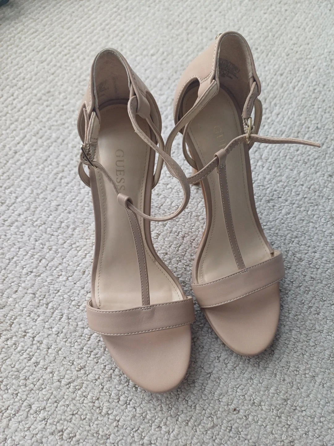 Guess heeled sandals in a nude colour. Features a t-strap design and adjustable ankle strap. They're a stylish choice for dressing up an outfit!
