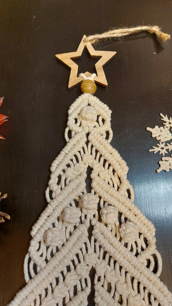 π The tree-shaped macrame hangs elegantly off a wooden star, adding a touch of rustic charm to your decor.