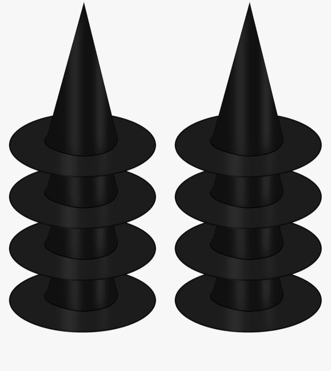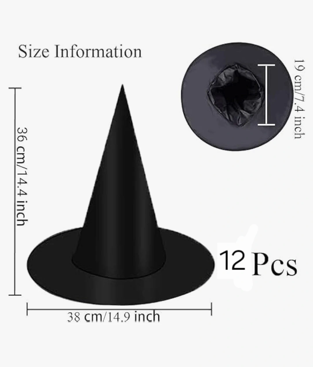 These are 12 black witch hats. They are made of fabric and are great for Halloween costumes. The hats measure 38 cm in diameter and 36 cm in height. The inner opening is 19 cm.