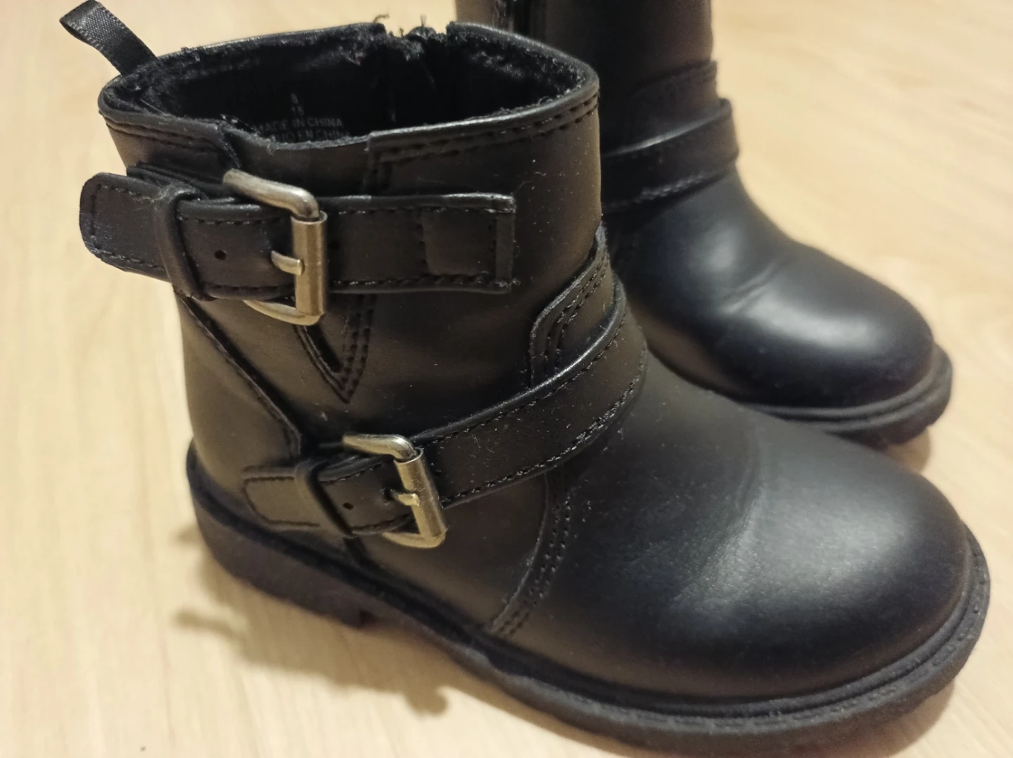 Black faux leather toddler boots from Old Navy. Features two buckle straps and a side zipper. Size is 8