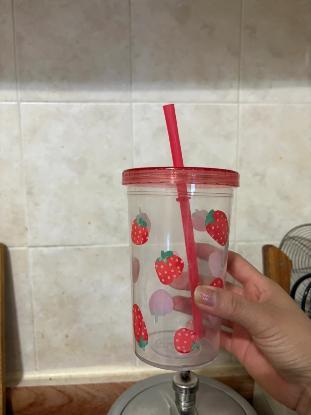 I have a couple of drinkware items up for grabs! There's an MBT stainless steel mug, perfect for keeping your drinks hot or cold. Also, a cute strawberry-themed cup with a straw, great for summer beverages