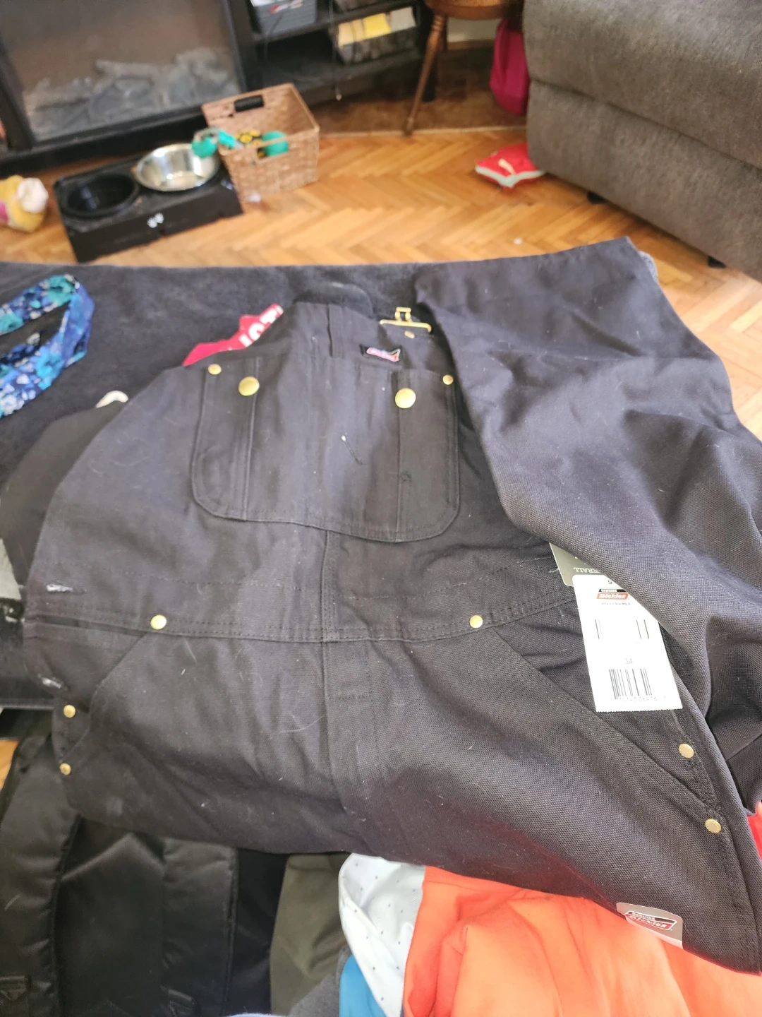 Dickies work overalls in black. Size 34 waist. These pants feature a durable canvas material with brass button accents. They're built for tough jobs! Never worn.