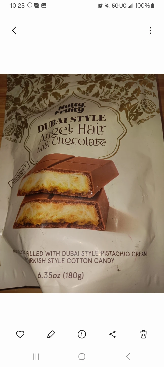 Nutty Fruity Dubai Style Angel Hair Milk Chocolate bar. It's filled with Dubai style pistachio cream and Turkish style cotton candy. 6.35oz (180g).