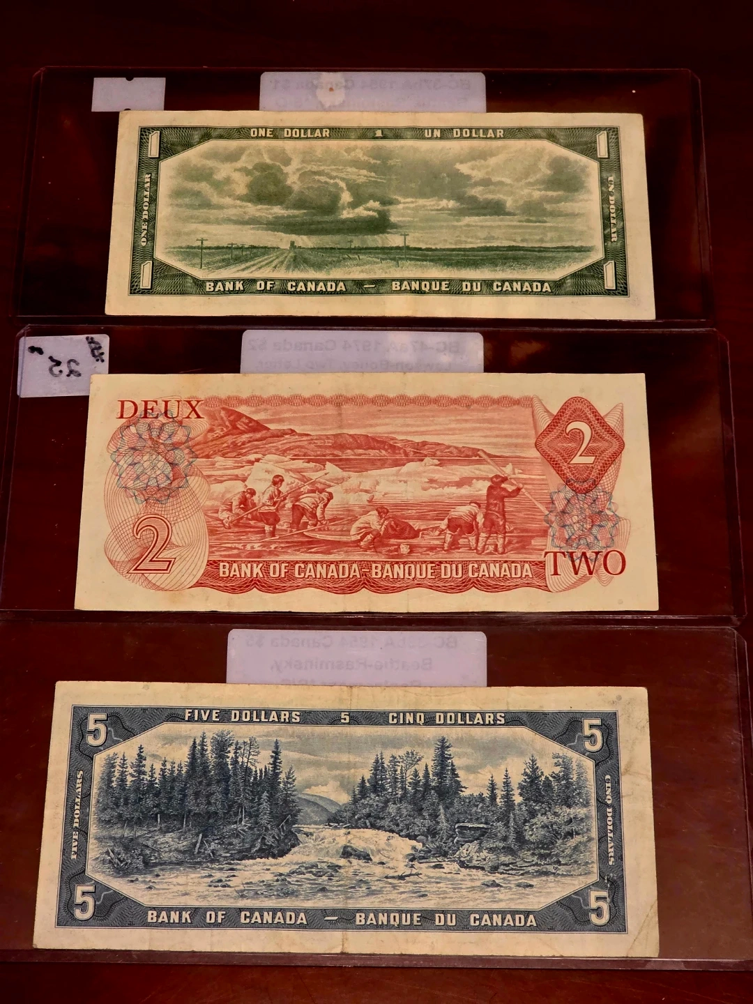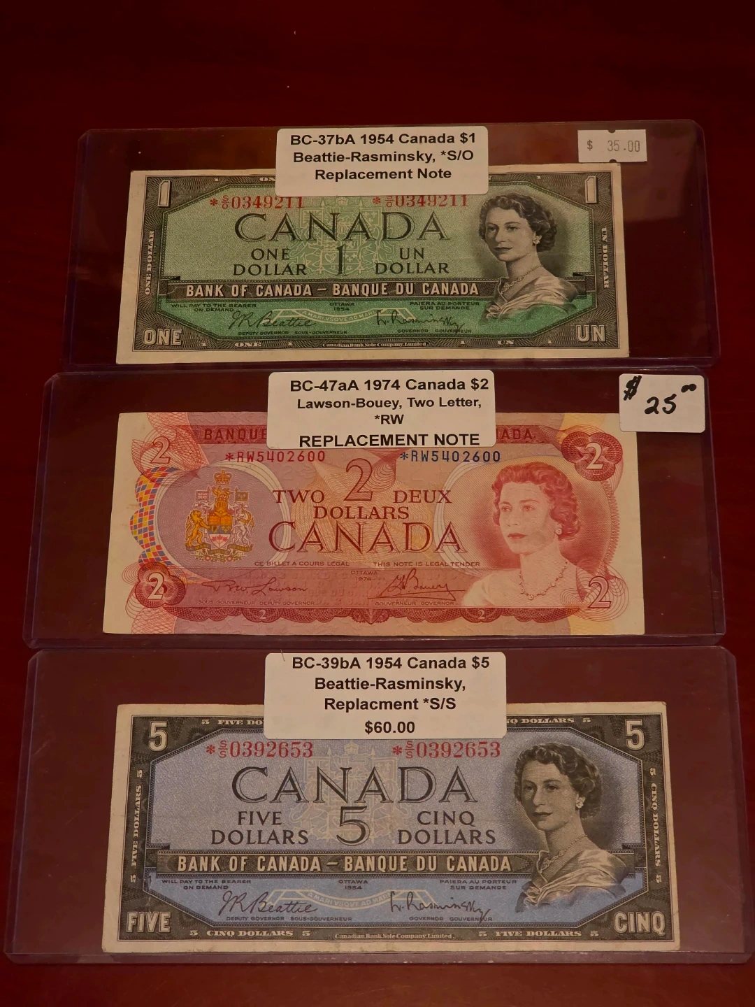 Selling a collection of vintage Canadian replacement. bank notes. Includes a $1 note from 1954, a $2 note from 1974, and a $5 note from 1954. Great for collectors!