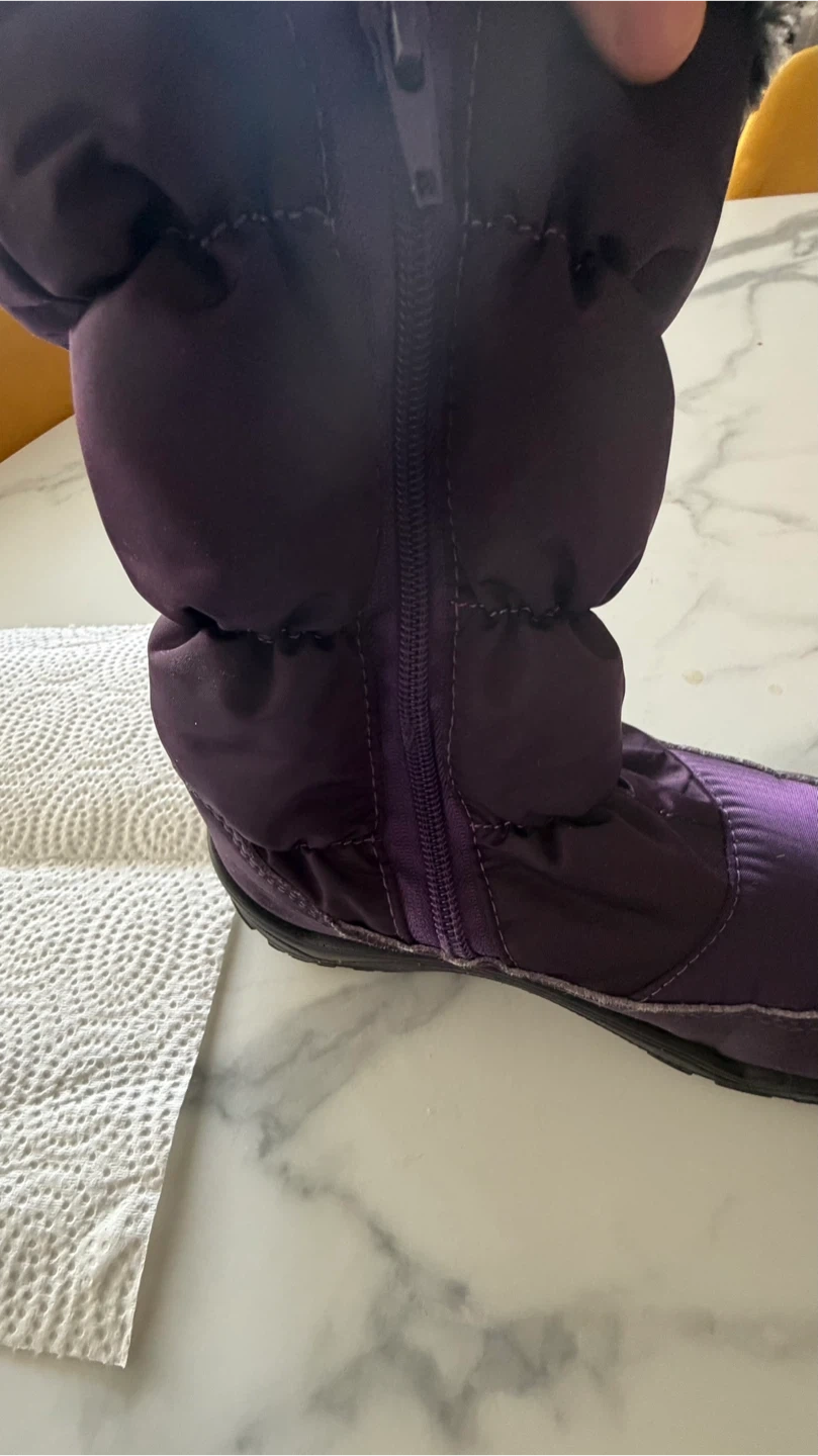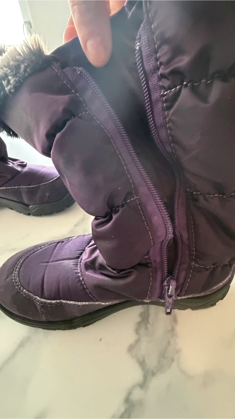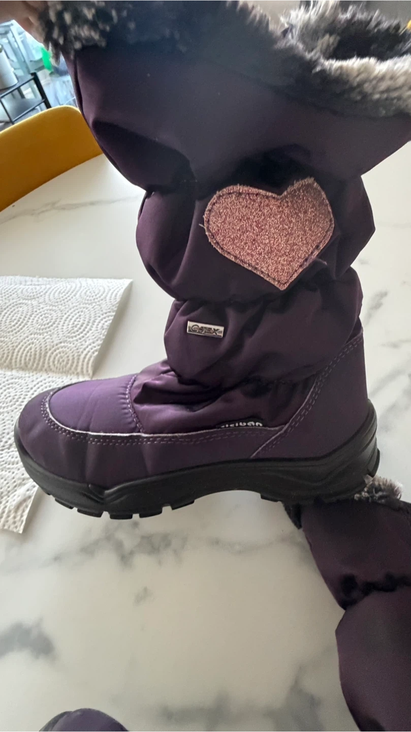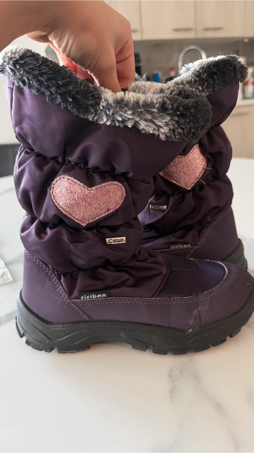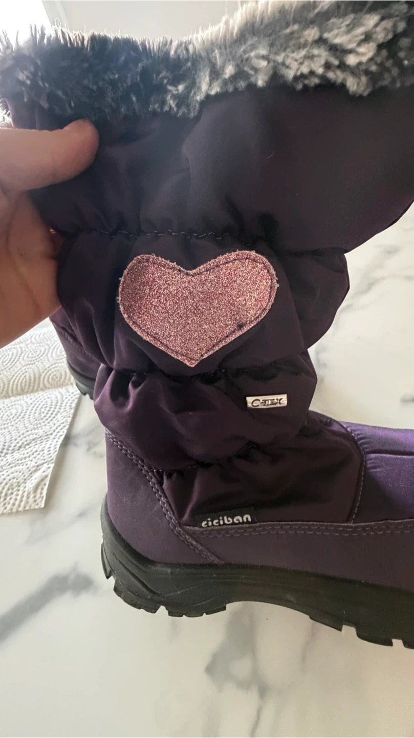 These purple Cicipan snow boots are perfect for keeping little feet warm and dry. They feature a zipper closure for easy on and off and a durable sole. Gore-Tex material provides waterproofing. Decorated with cute pink glitter hearts and faux fur trim. Used twice