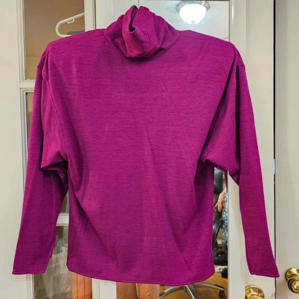 Ungaro at Bergdorf Goodman blue-violet bargello long-sleeve blouse with high turtleish neck. Sleeves are zippered at end. Removable shoulder pads.