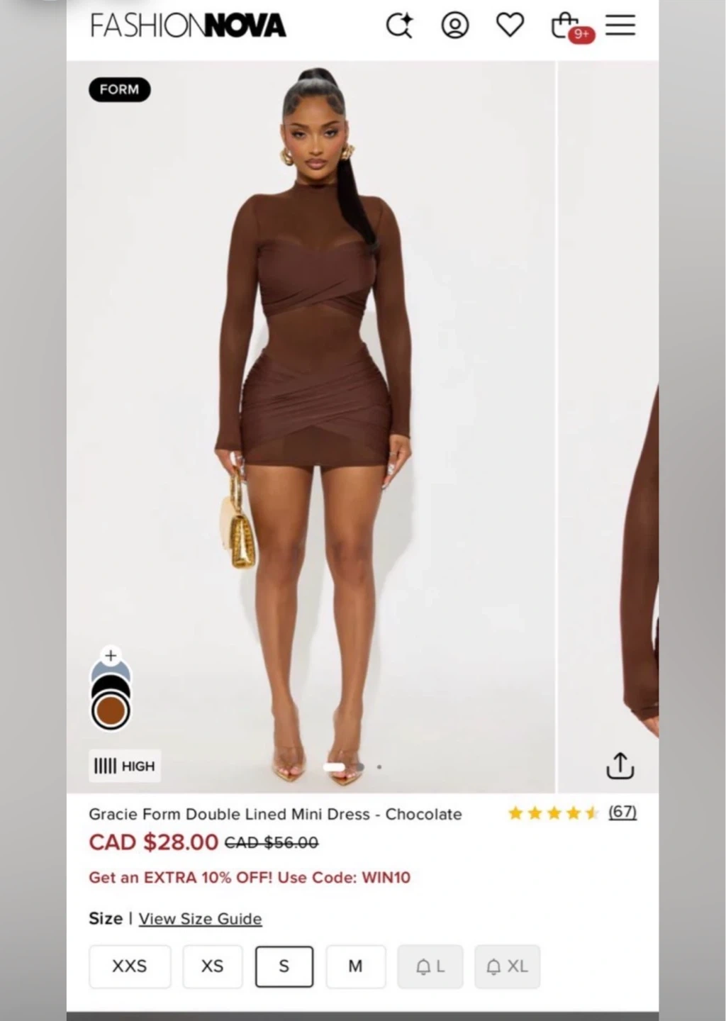 This Fashion Nova Gracie Form dress comes in a chocolate colour. It's a double-lined mini dress with a sheer overlay. The dress has a wrap-style front and long sleeves.