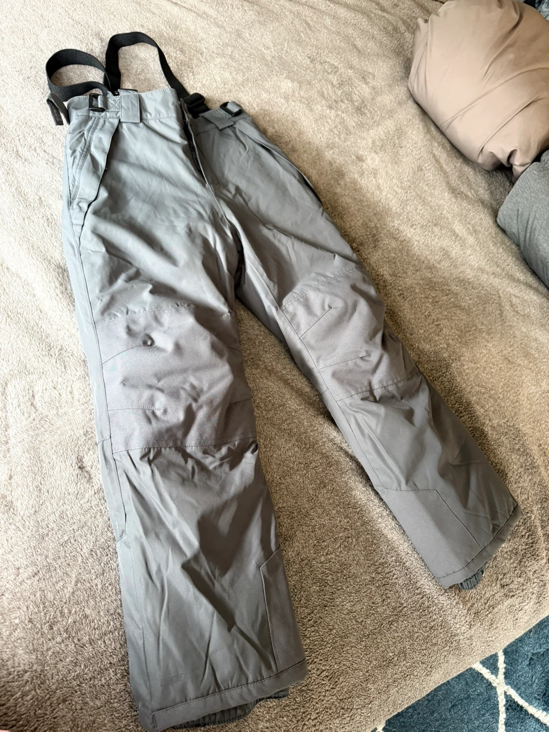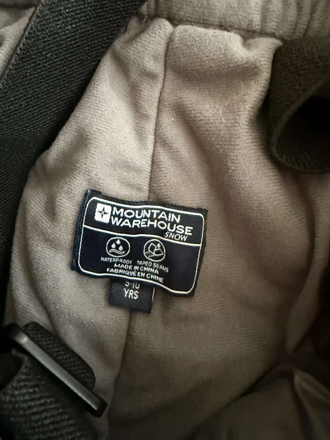 These grey snow bib pants are from Mountain Warehouse and are waterproof with taped seams. They're sized for 9-10 years. They feature adjustable straps for a comfortable fit. Great for keeping warm and dry during winter activities! My son wore it once.