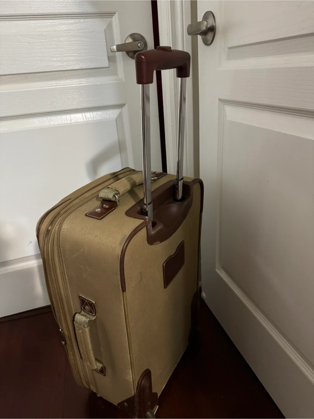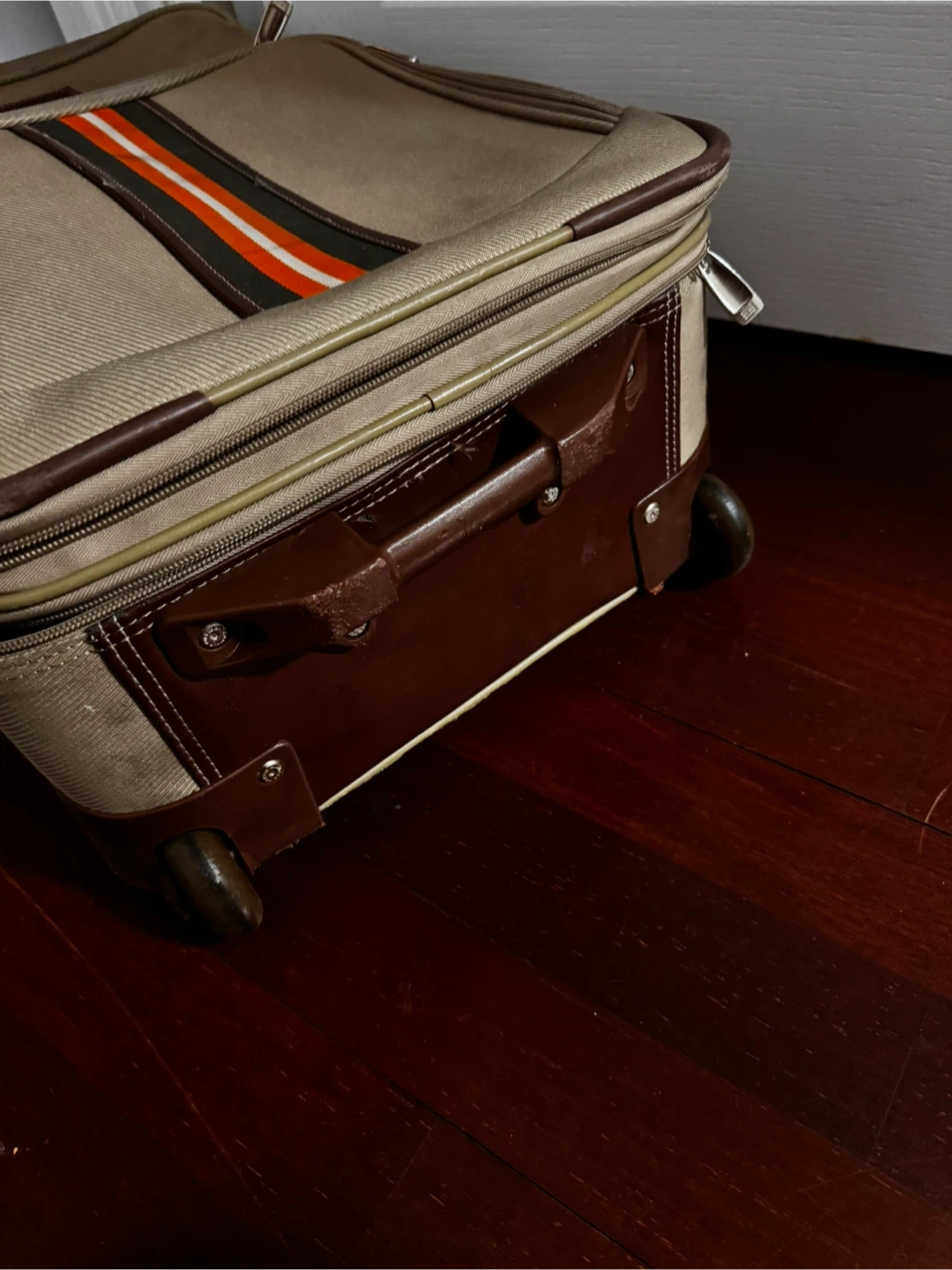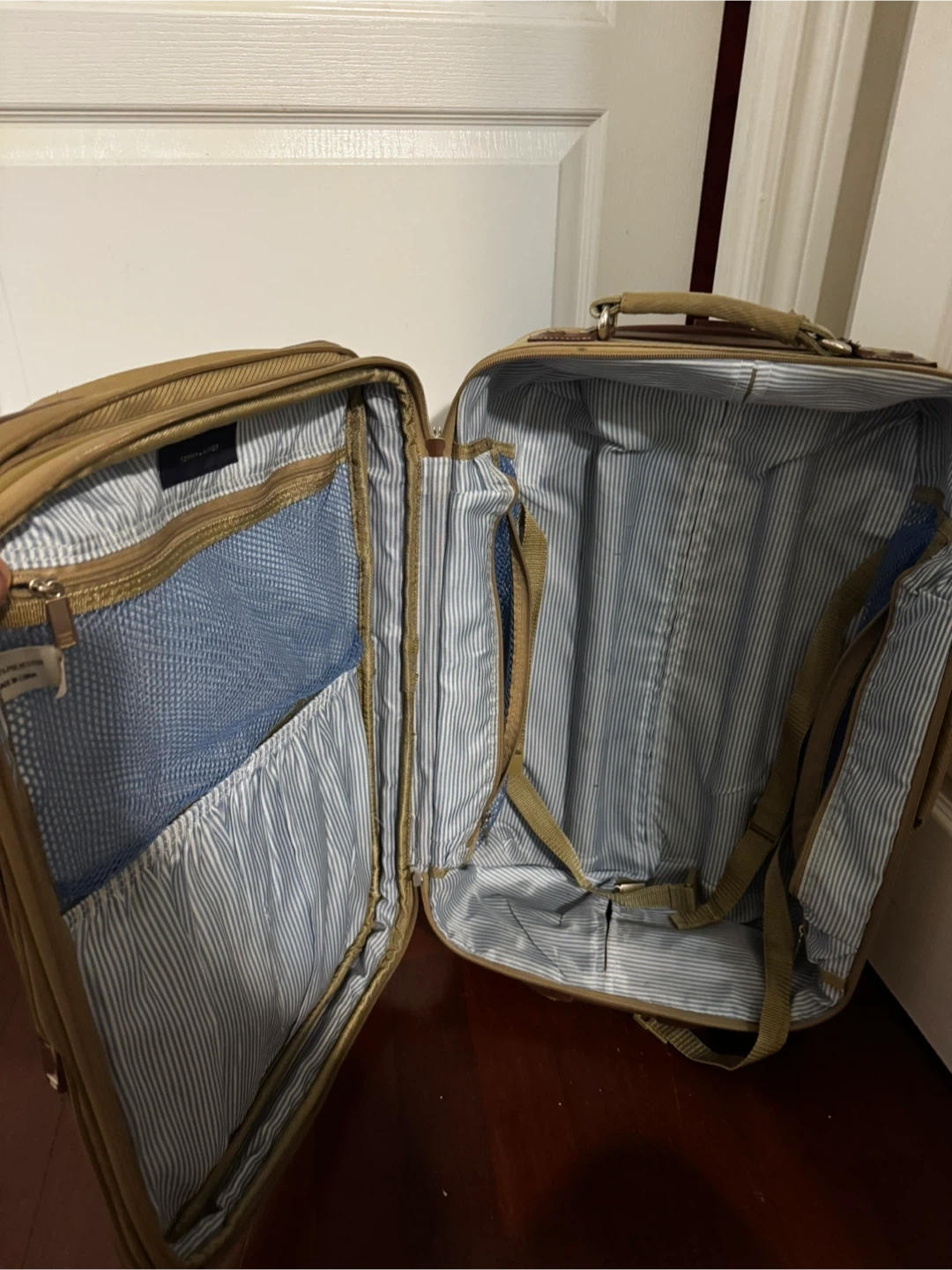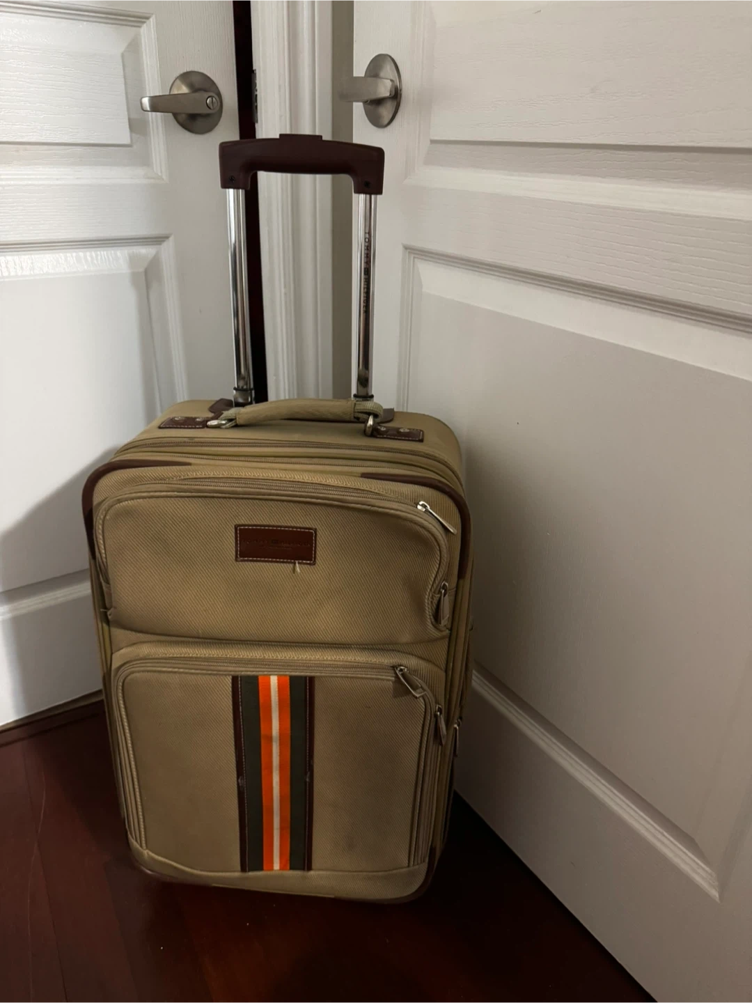 Tommy Hilfiger rolling Carry On in a tan colour. Features a retractable handle and dual wheels for easy transport. It has a front zippered compartment with colourful stripe accents.
