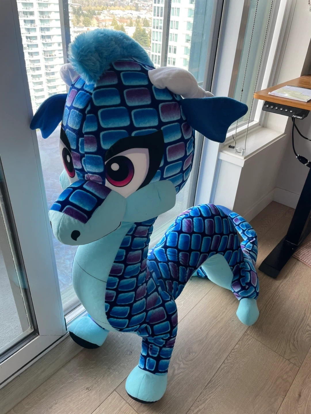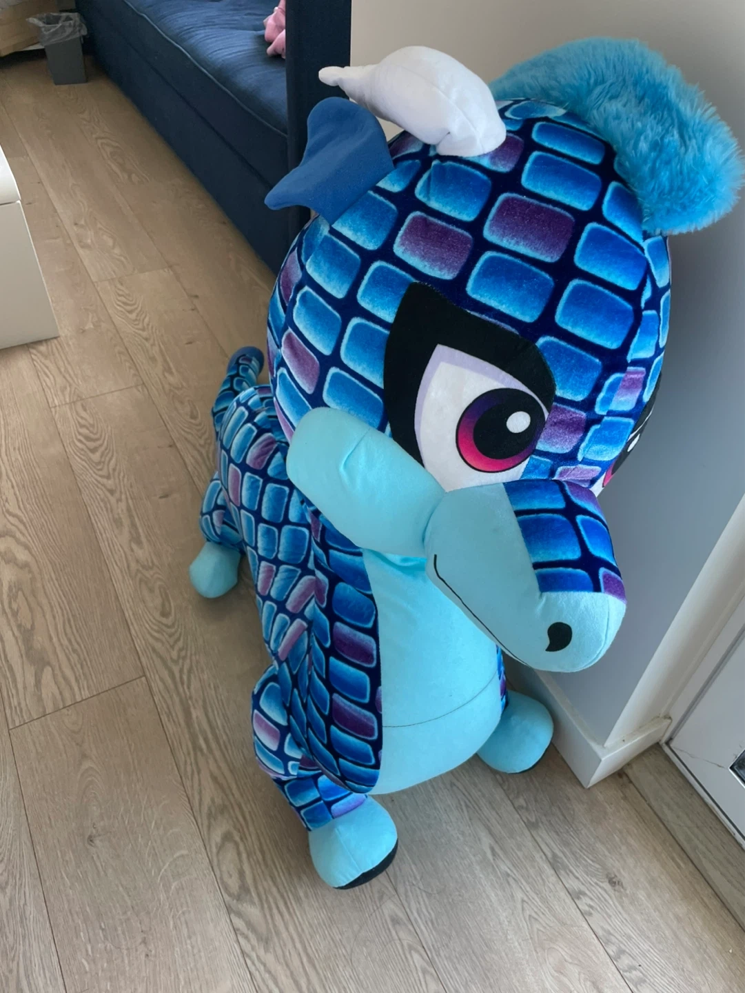 This is a large, plush stuffed animal dragon. It's blue and purple with scale details and soft fur accents. Its large size makes it great for cuddles or as a room decoration. This dragon is ready for a new home!