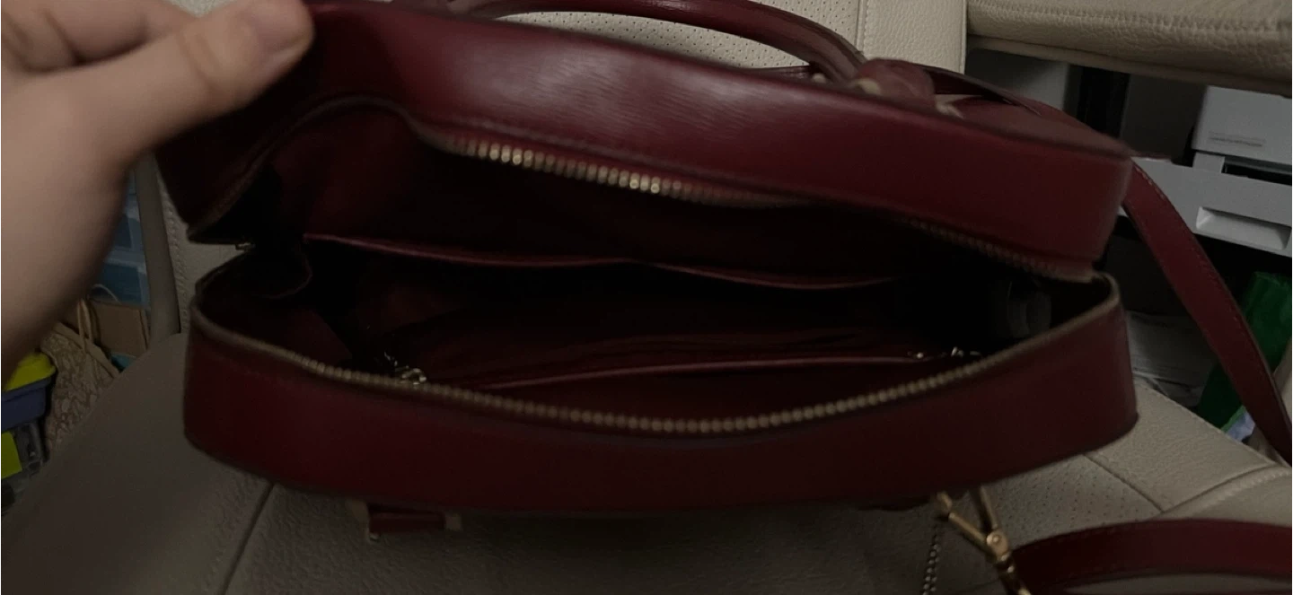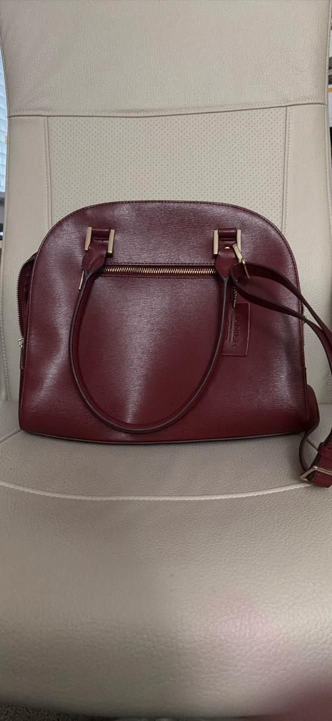A stylish Danier leather handbag with a zip closure. It features an interior zip pocket and slip pockets for organization. It's a great everyday bag!
