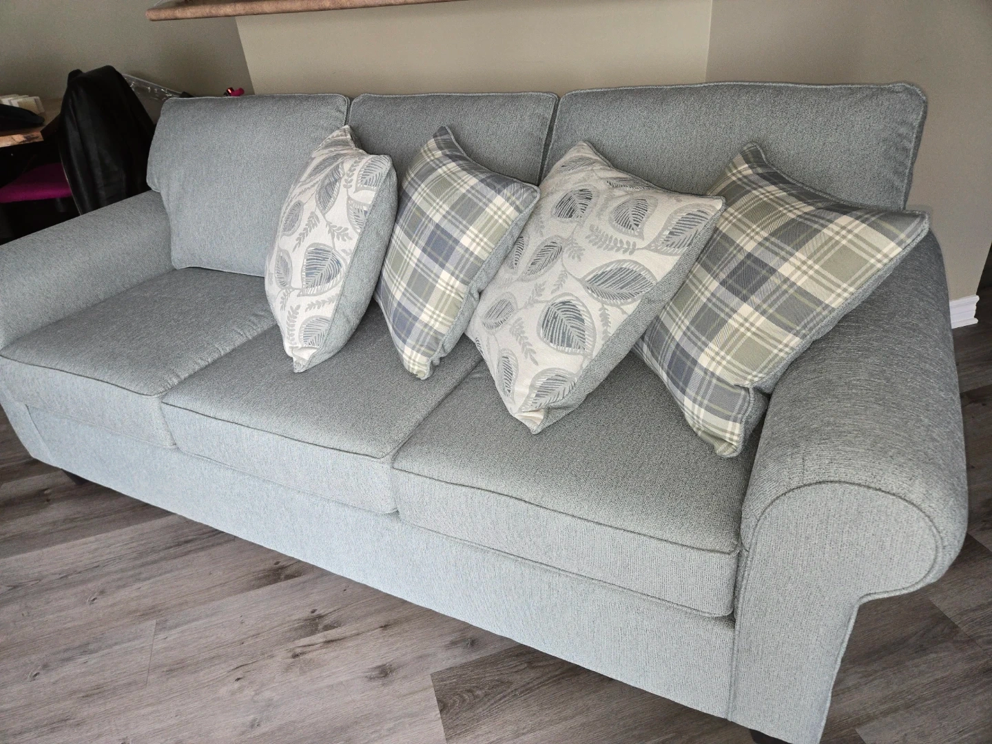 This blue fabric sofa comes with four decorative accent pillows. It's a comfortable three-seater couch with a classic design. The sofa's material appears to be a durable tweed or similar textured fabric. From Brick