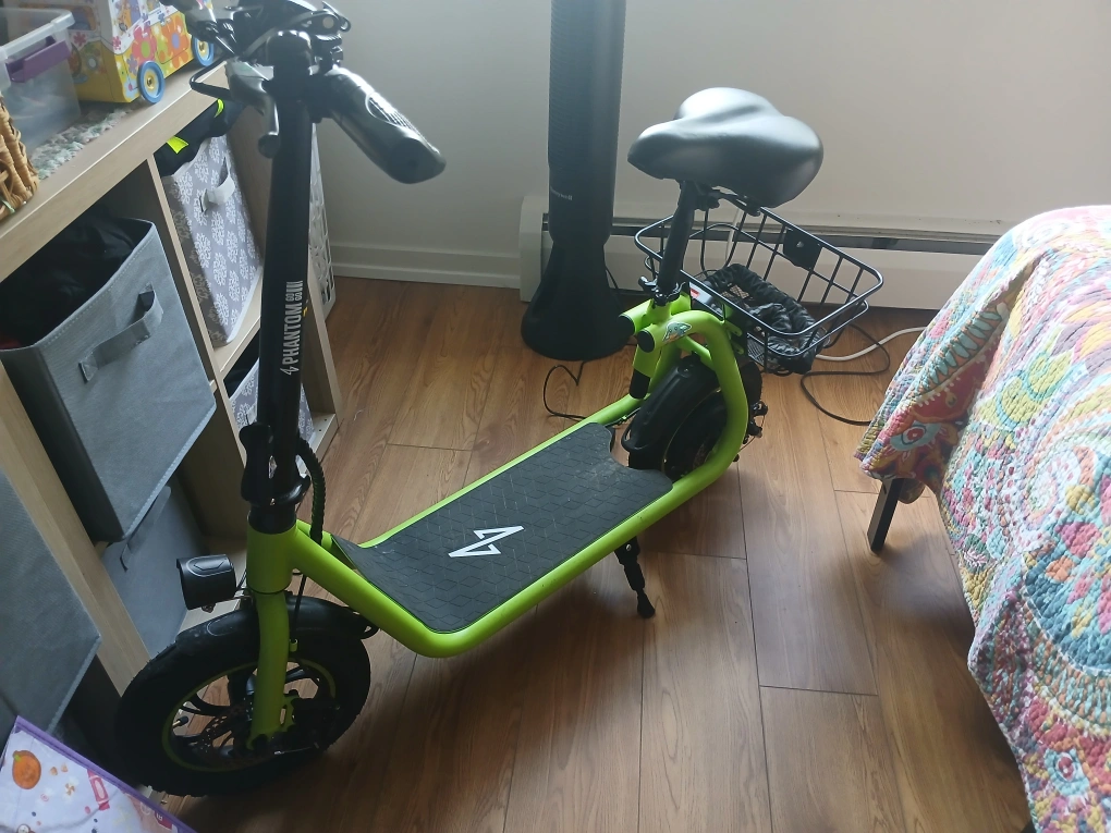 10Selling an Apollo Phantom electric scooter in a vibrant green colour! It comes with a seat and a basket, perfect for errands or leisurely rides around the neighbourhood! The scooter is in great shape and ready for a new home