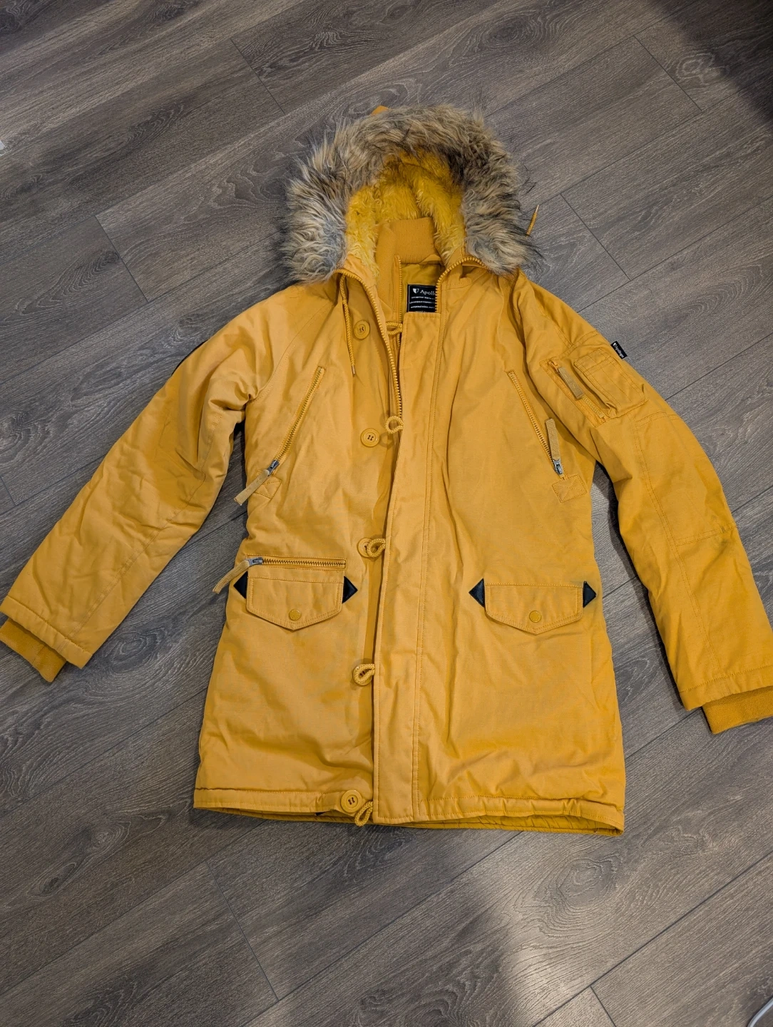 71Here's a cozy yellow winter parka! It has a faux fur hood and lots of pockets. Perfect for staying warm this winter season.