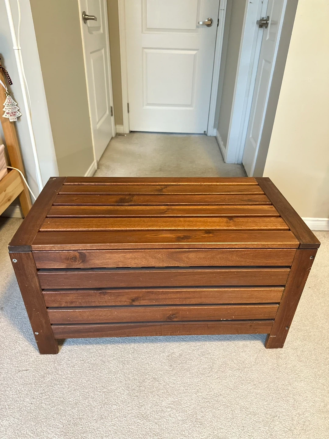 18Selling a gently used IKEA Applaro storage bench in brown stained finish. This bench is perfect for outdoor or indoor use, providing both seating and storage. It's in great condition and ready for a new home!