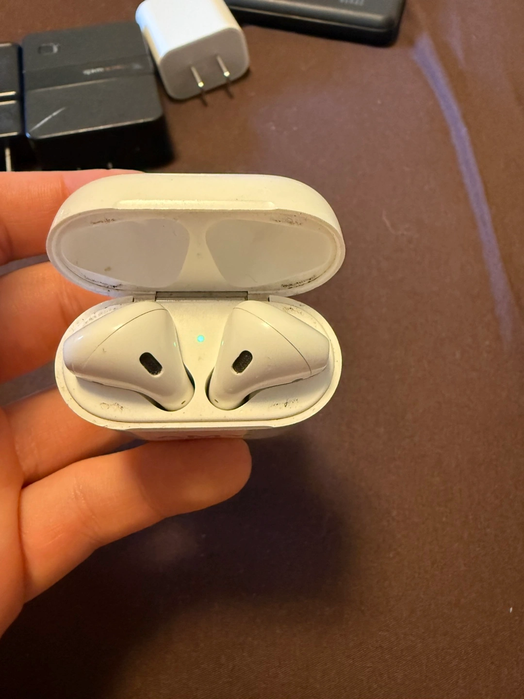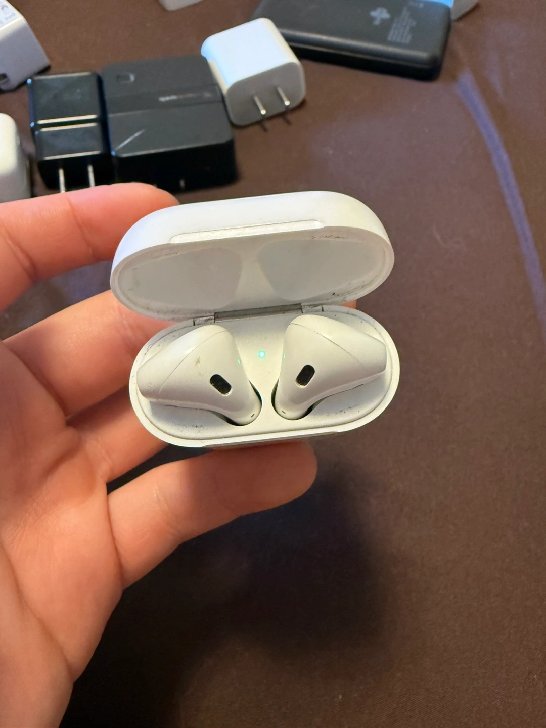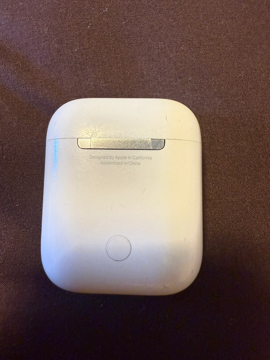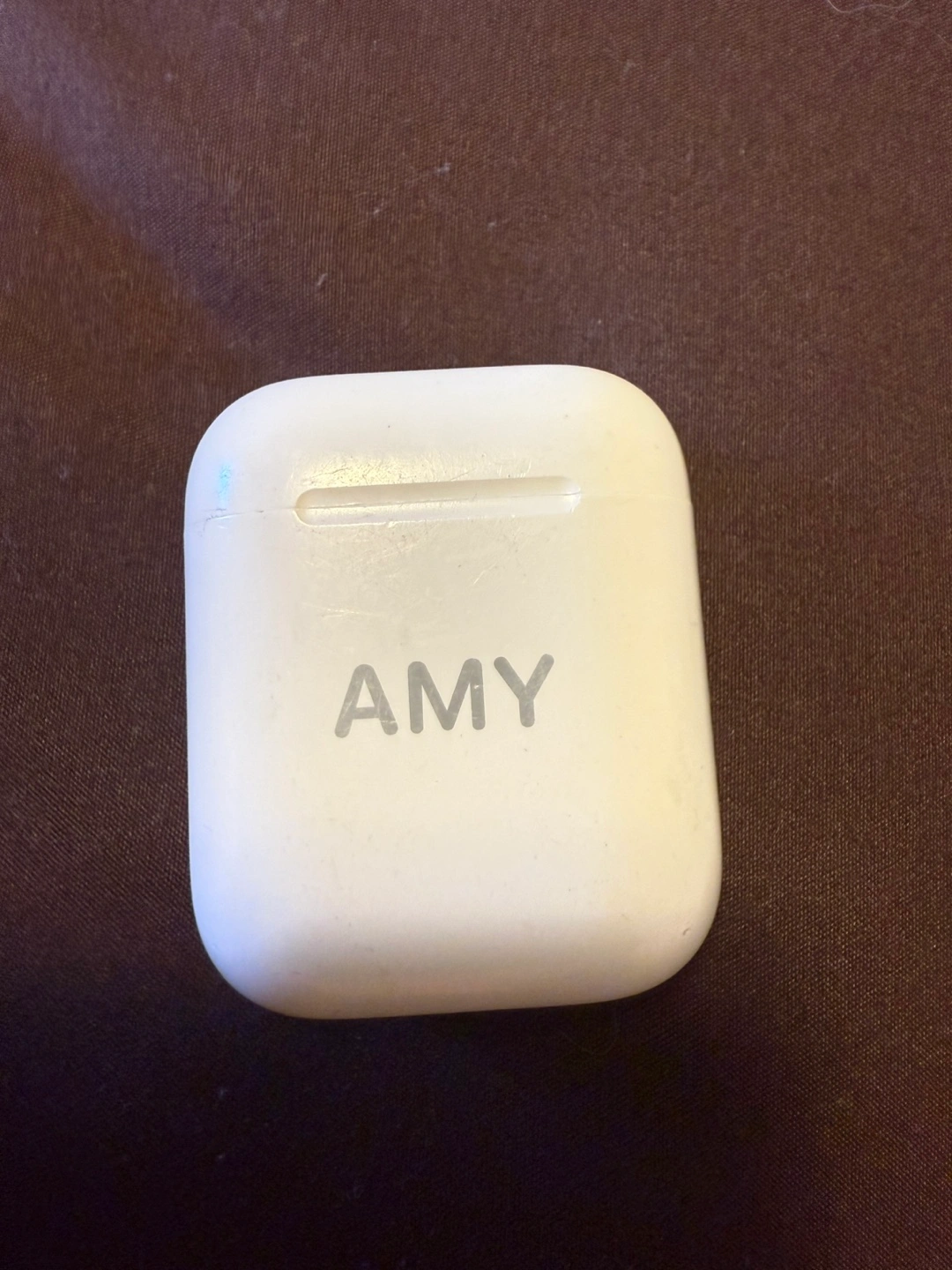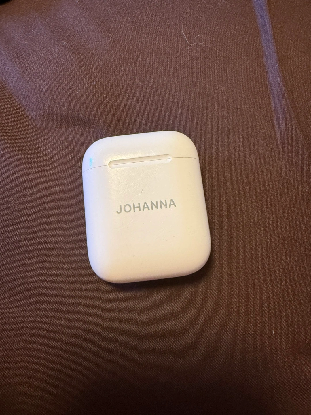 Selling a pair of Apple AirPods (2nd generation). They're in used condition with some visible wear and tear. Both cases are personalized with names. They both sound a little muffled but still work