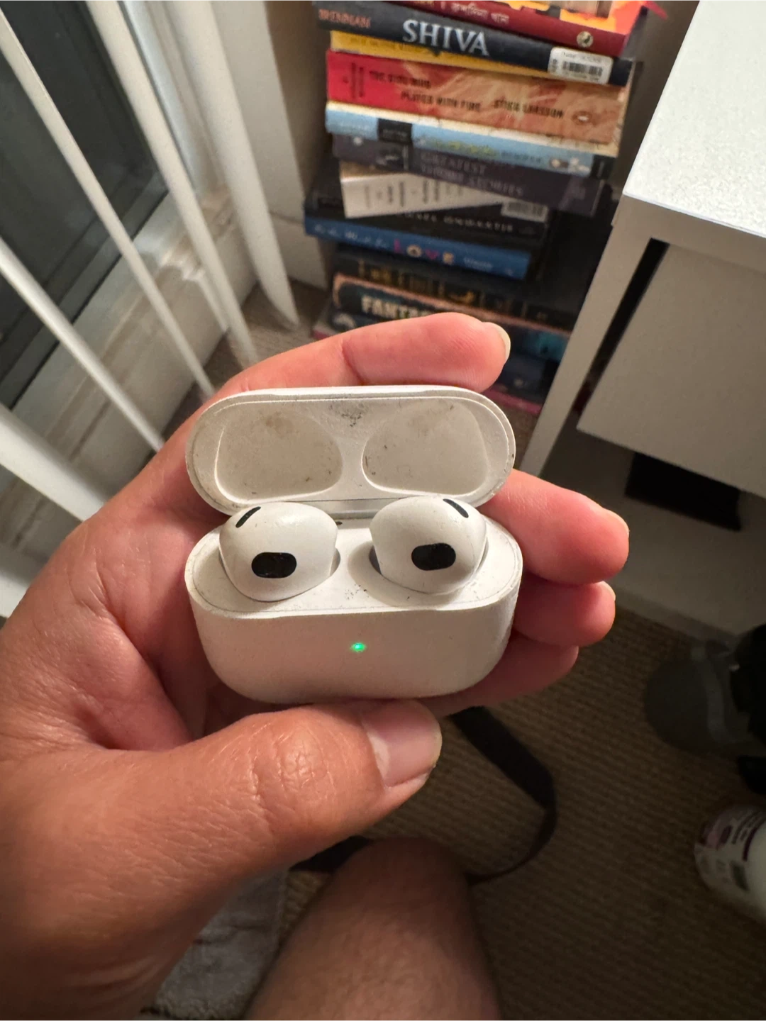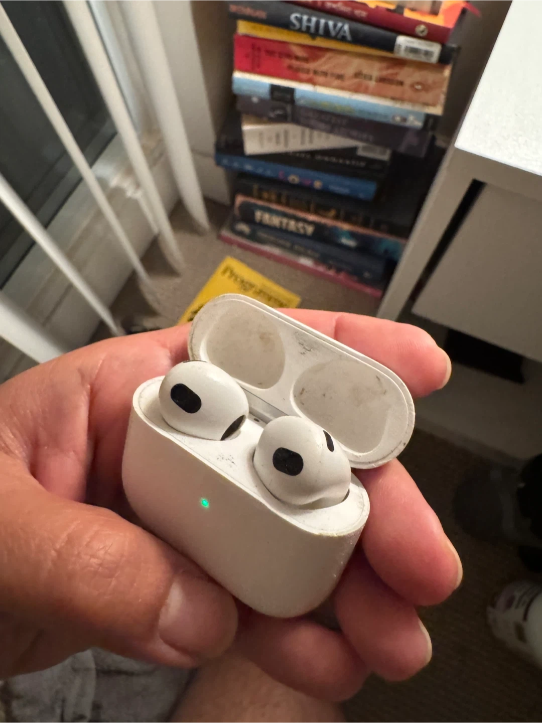 53a pair of Apple AirPods 3rd generation! They are in good working condition and come with the charging case. They have some signs of wear, but still work great