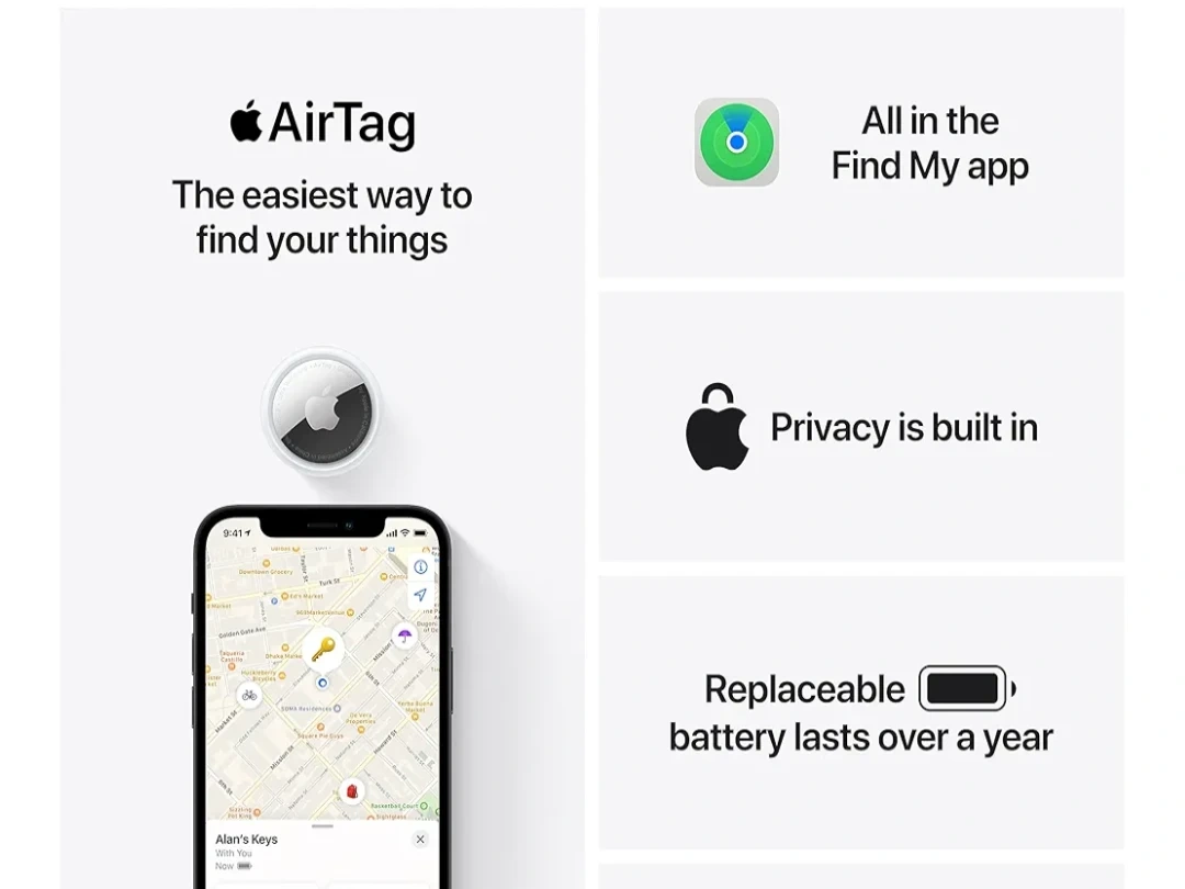 54Keep track of your belongings with the Apple AirTag! It's designed to help you find your things easily using the Find My app. The replaceable battery lasts over a year, and privacy is built in. Super handy for keeping track of keys, wallets, or anything else you tend to misplace!
