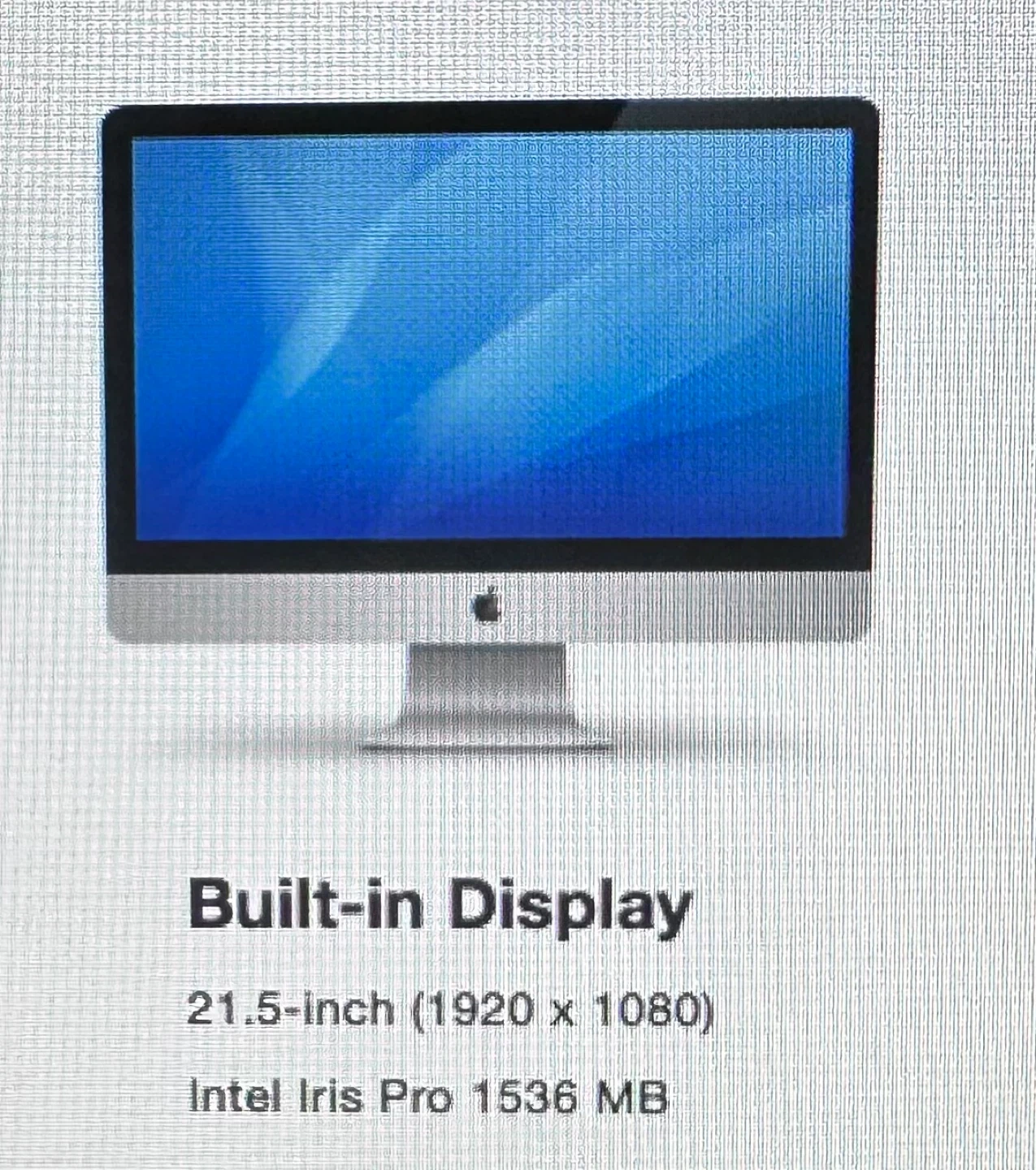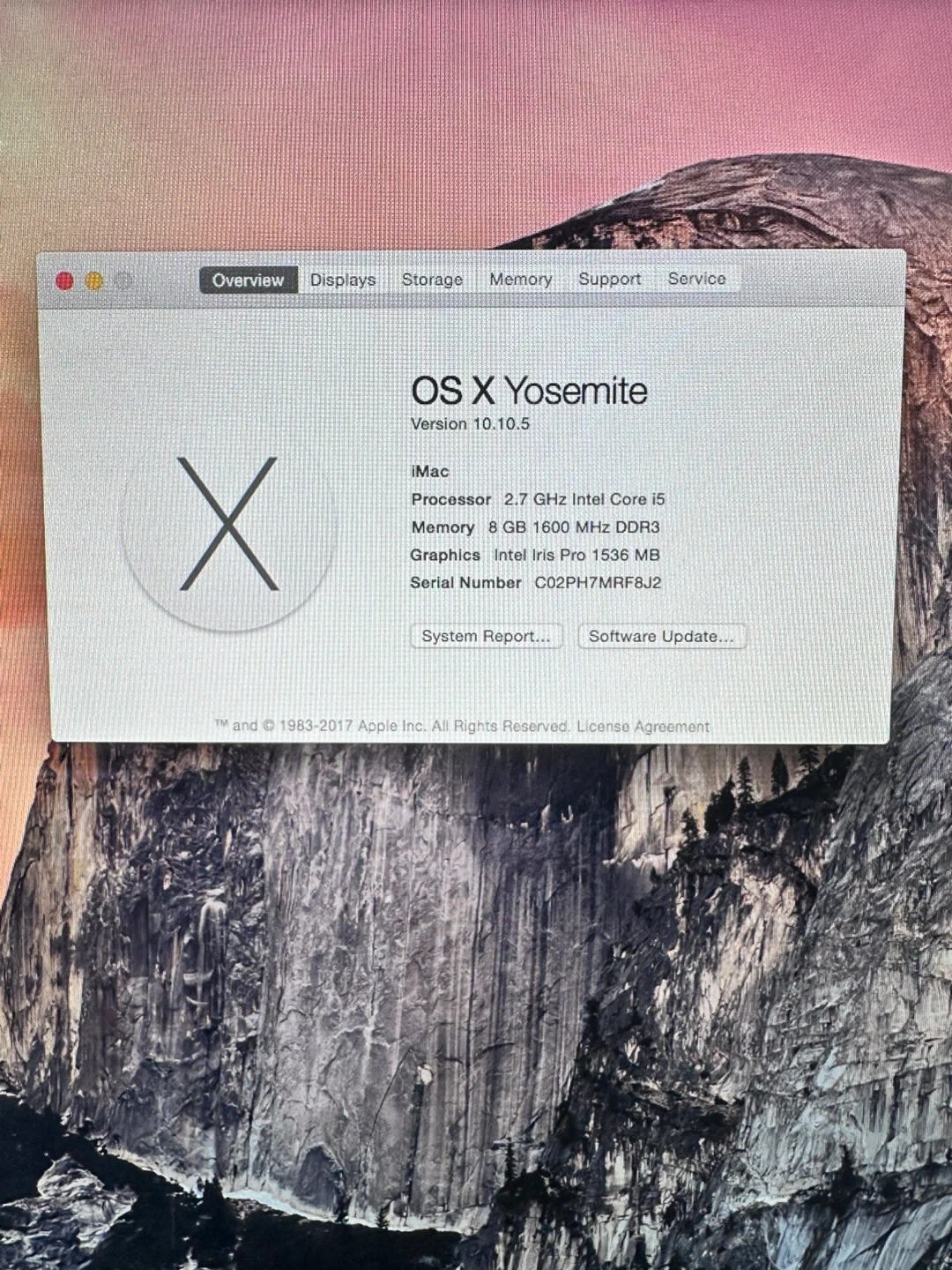 53Selling an Apple iMac 2013 with a 21.5-inch built-in display. It runs OS X Yosemite. Specs: - 2.7 GHz Intel Core i5 - 8 GB 1600 MHz DDR3 Memory - Intel Iris Pro 1536 MB Graphics