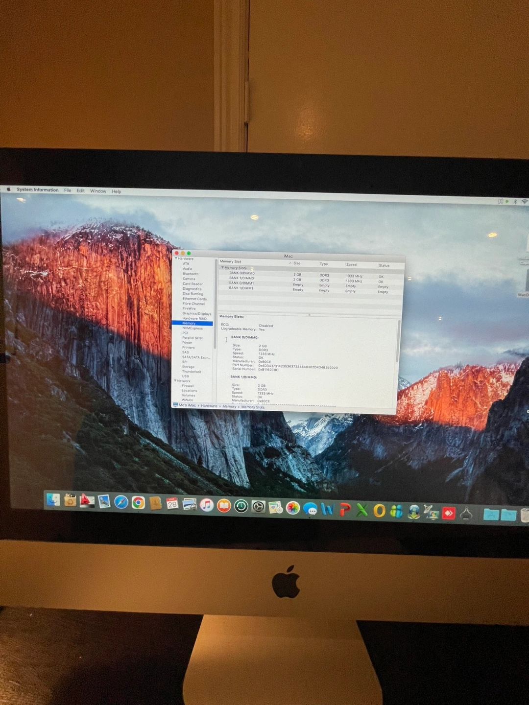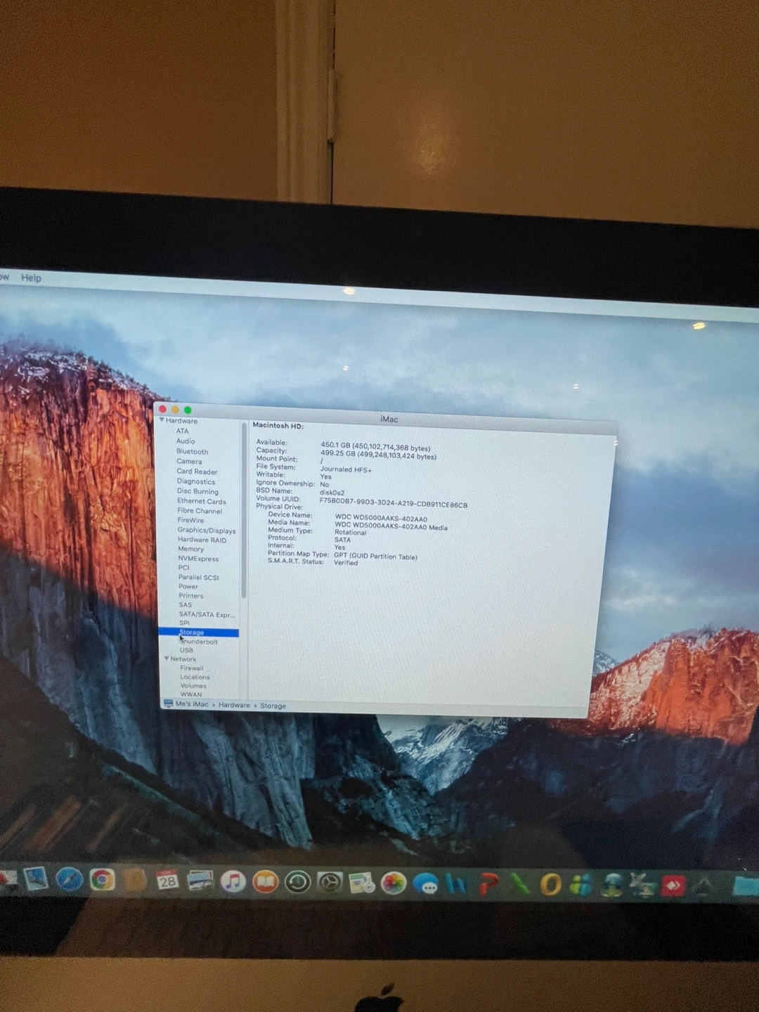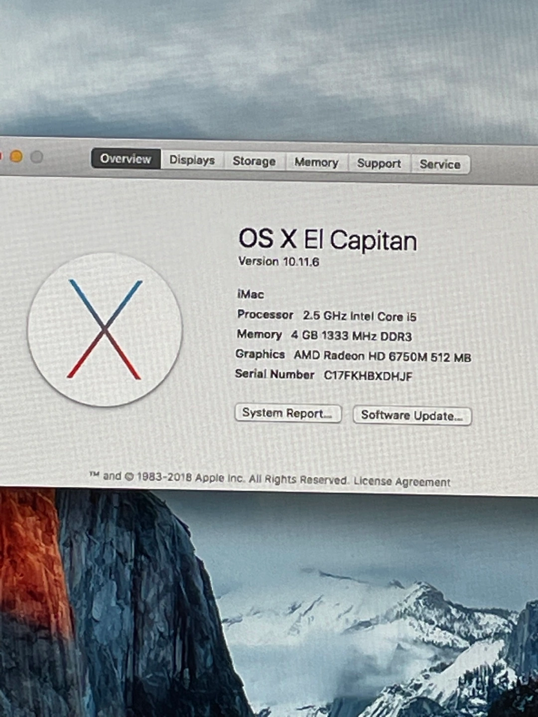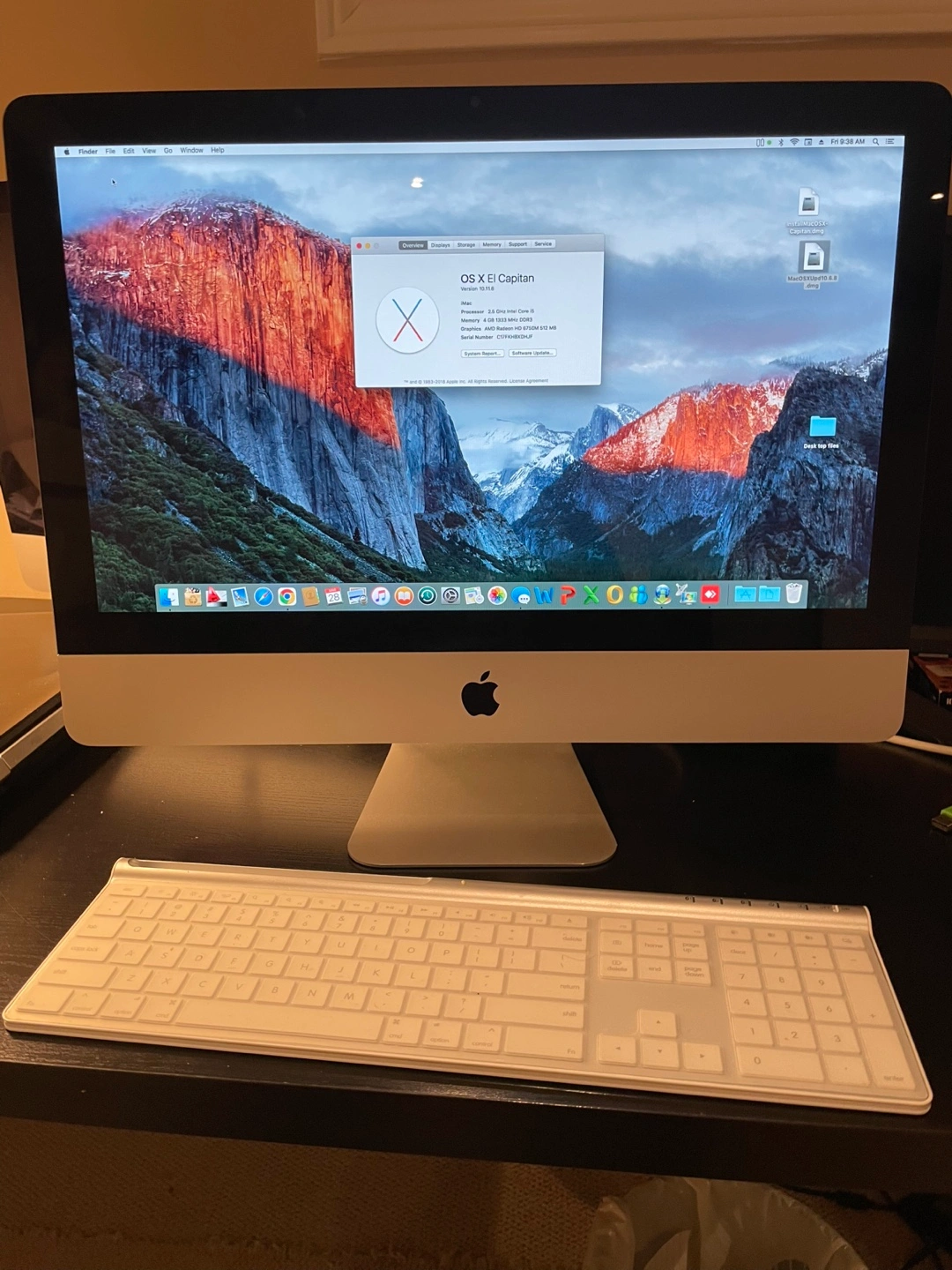 iMac desktop computer. Includes keyboard. OS X El Capitan. 2.5 GHz Intel Core i5 processor. 4 GB RAM. AMD Radeon HD 6750M graphics. 512 MB memory. Hard drive specs in images. Original cd