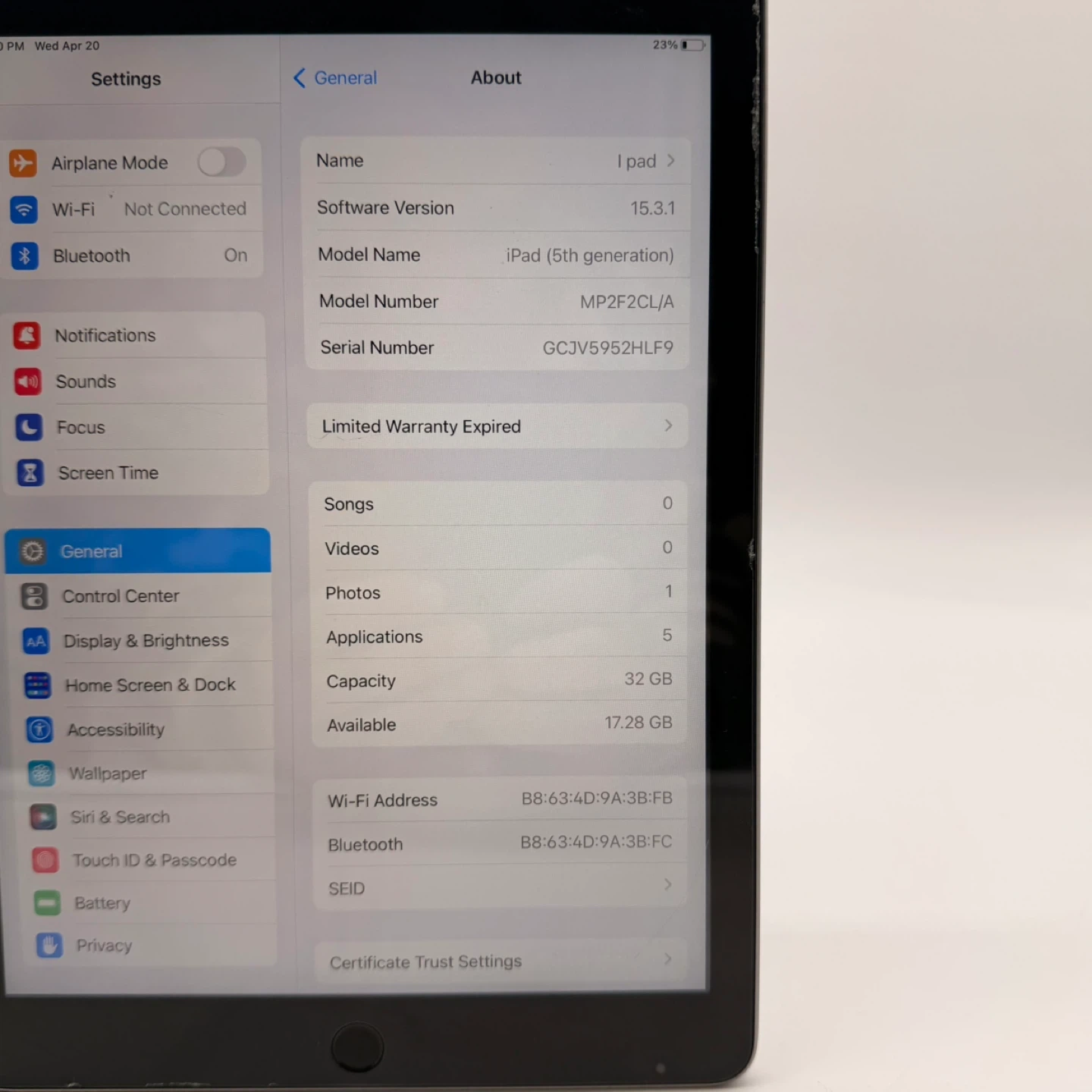 119Apple iPad (5th Generation) 32 GB Wi-Fi model A1822 in space gray. Works great — touchscreen and display are fully functional, and battery holds a charge well. The screen glass is cracked, but it doesn’t affect touch or performance. There are also a few edge dents (see photos) and light signs of wear. Factory-reset and ready for setup. Perfect for browsing, streaming, or as a backup tablet. Includes iPad only (no charger or box). 📍 Pickup in North York 🚗 Delivery available for an extra fee 172 tab
