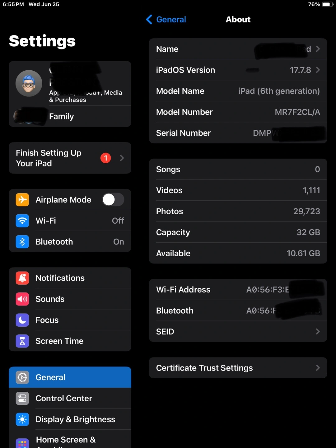 96Selling my iPad 6th generation with 32GB of storage. It's in great condition and running the latest iPadOS 17.7.8! Model number is MR7F2CL/A. Feel free to reach out if you're interested or have any questions