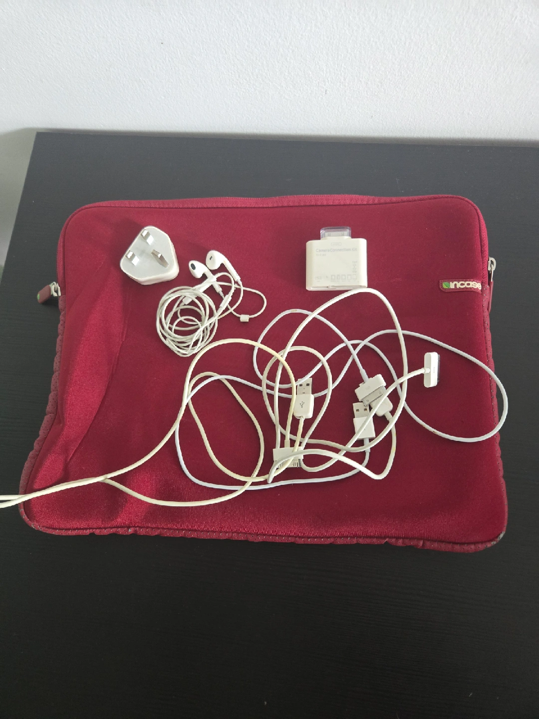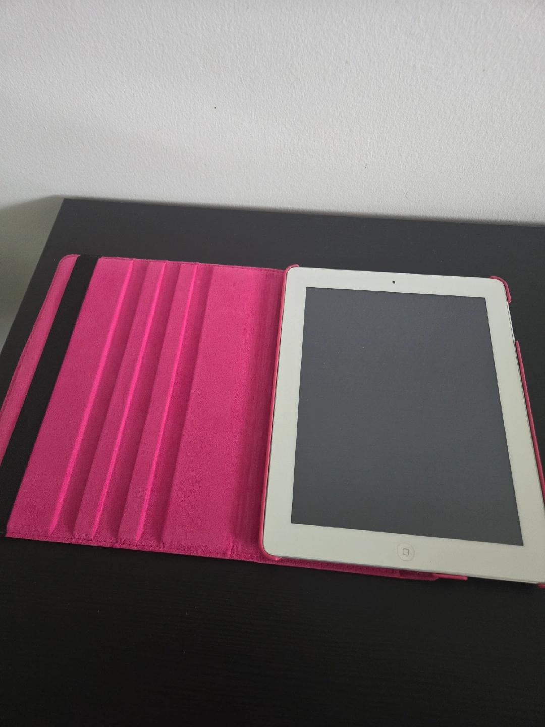 Selling an Apple iPad with a pink case! Comes with the pictured accessories, including a charger and headphones. The case is in good condition and will keep your iPad protected.
